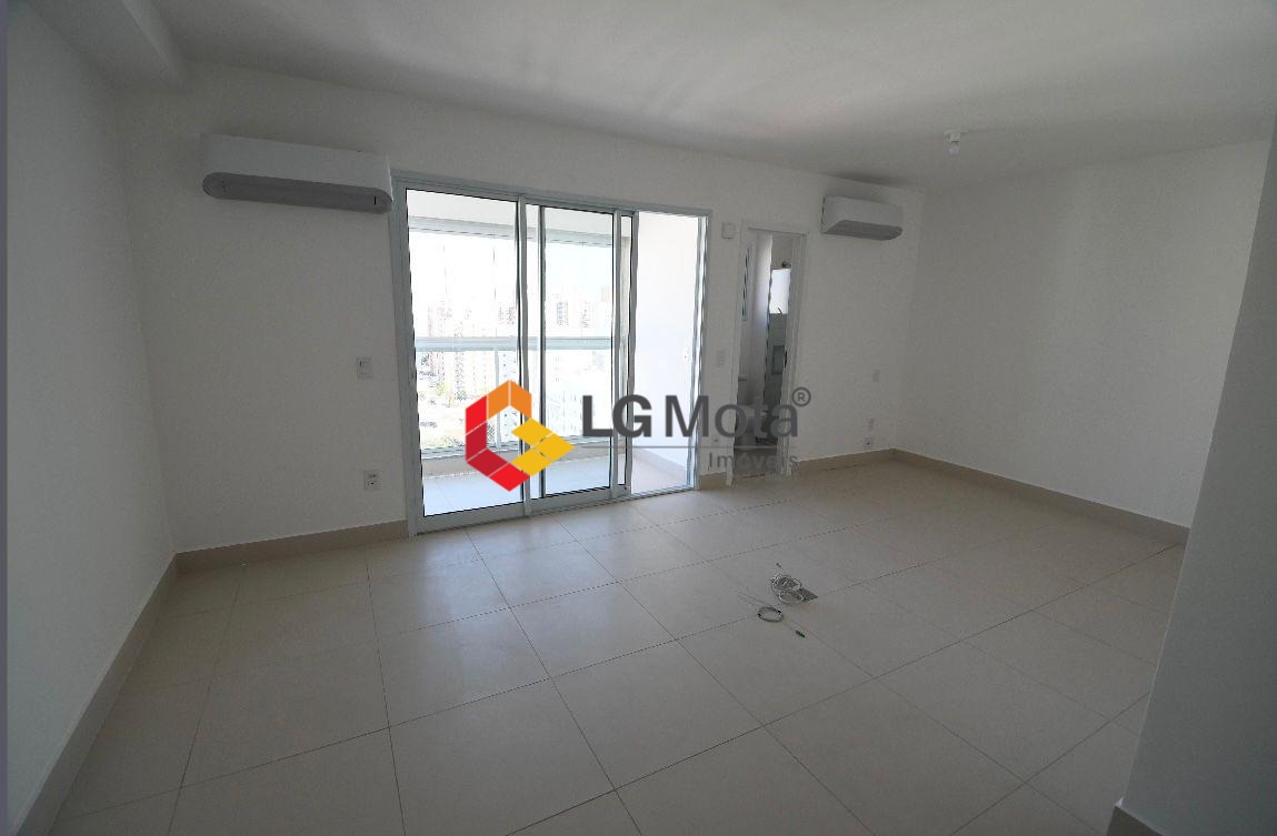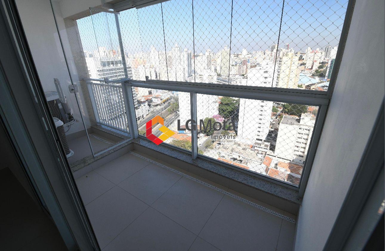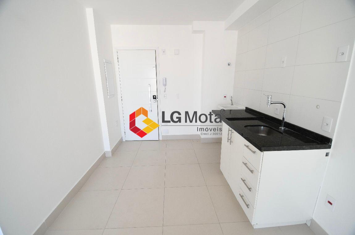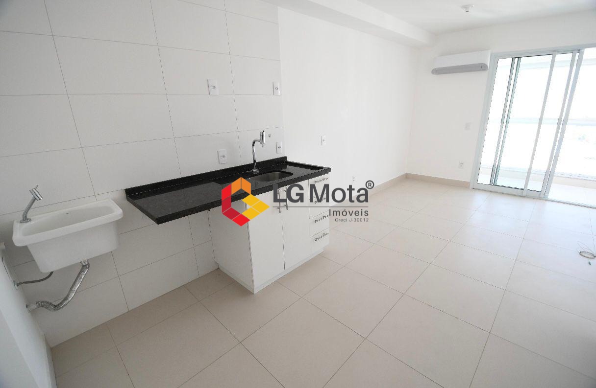 Apartamento tipo Studio com 41,7m². 2 aparelhos de ar condicionado, cozinha com armários embaixo da pia, banheiro com iluminação natural e gabinete, ampla varanda com fechamento de vidro.