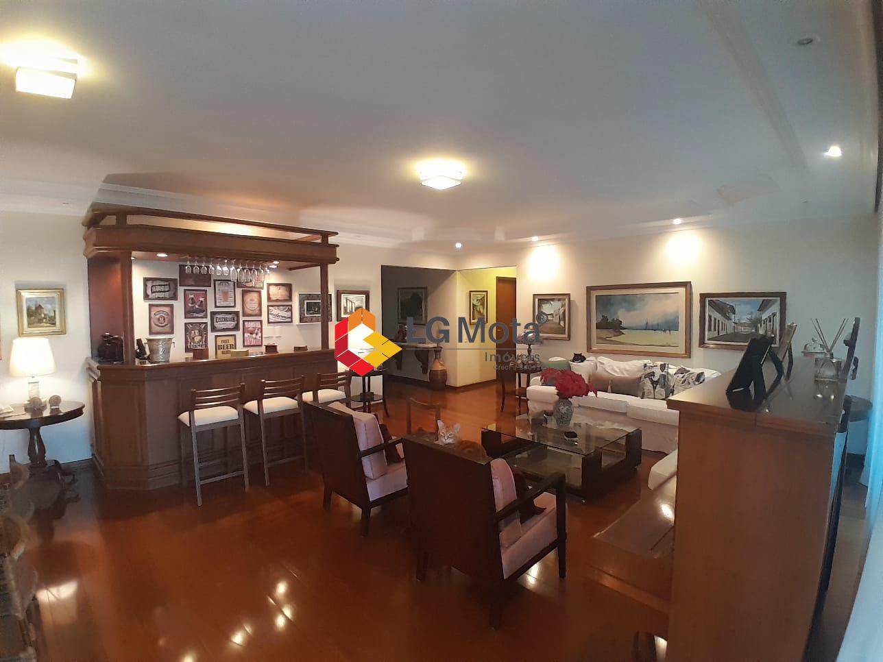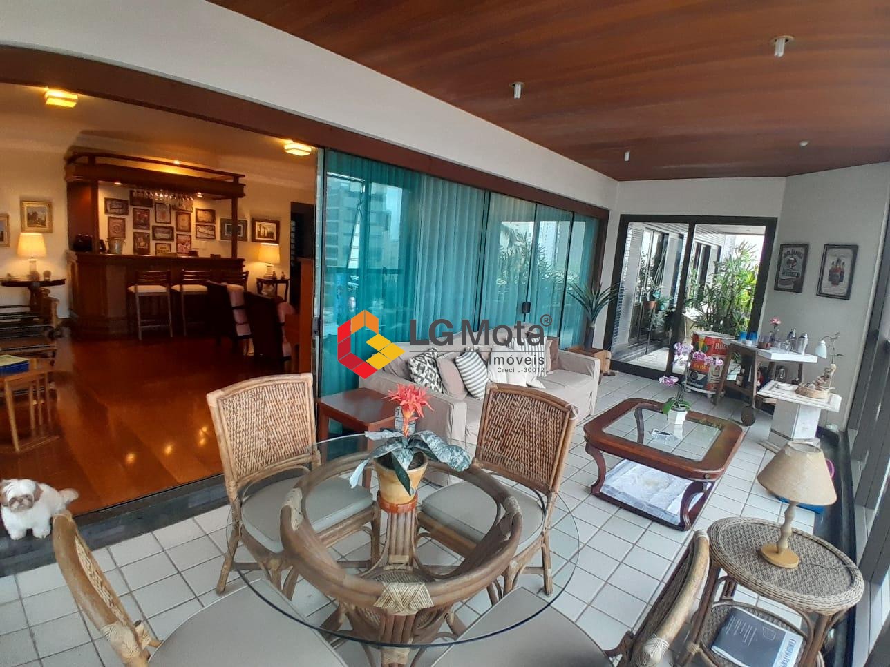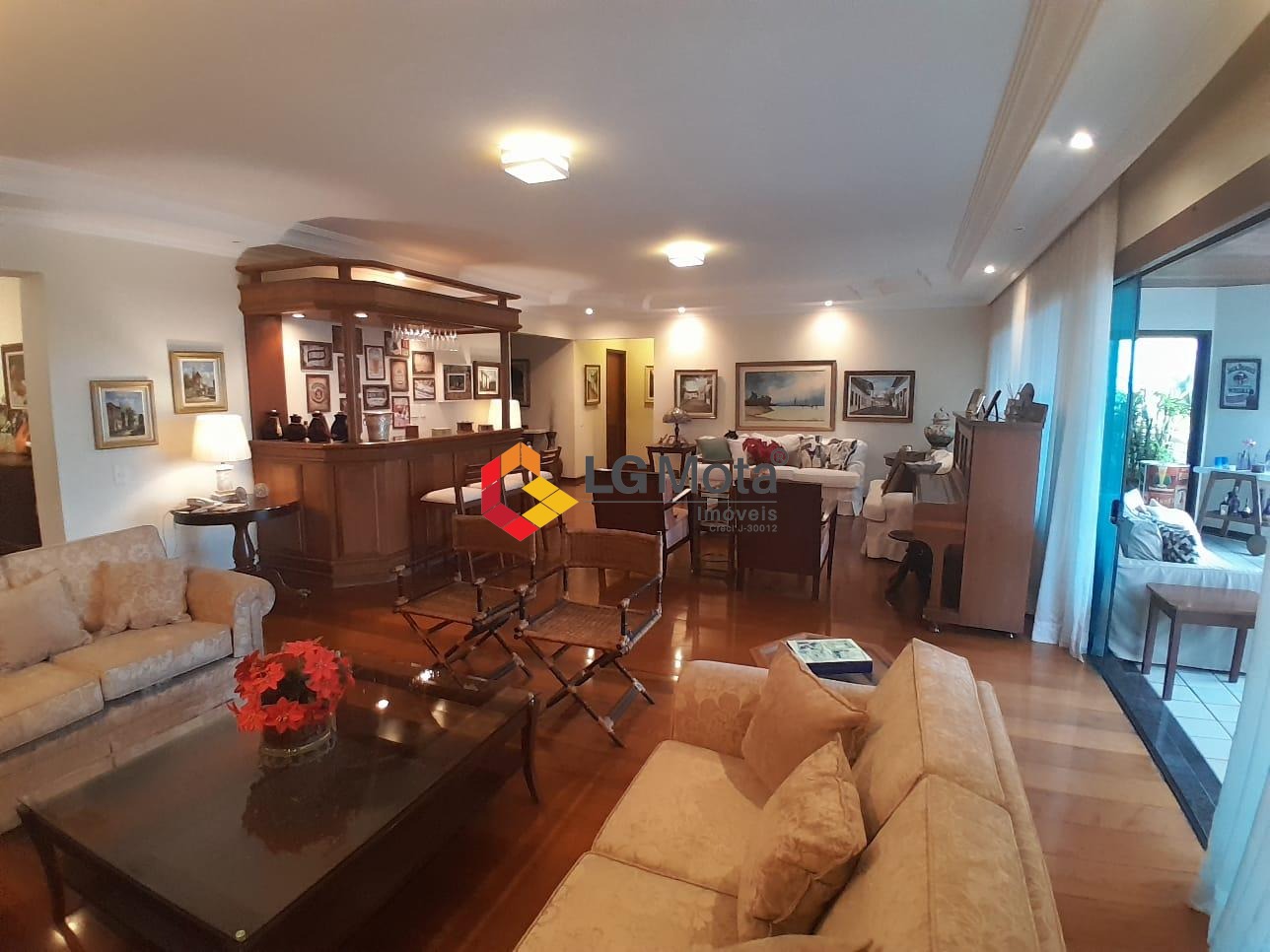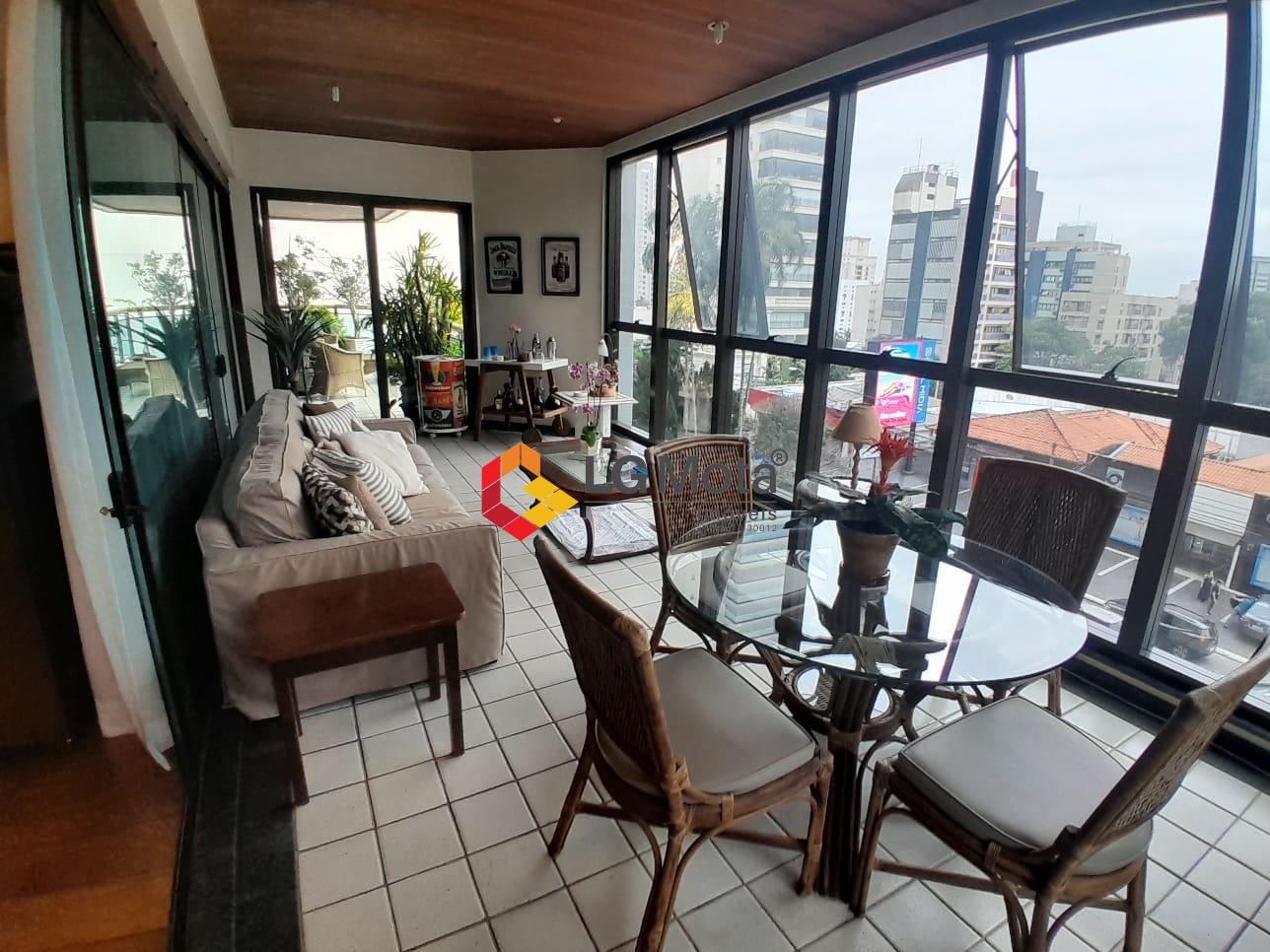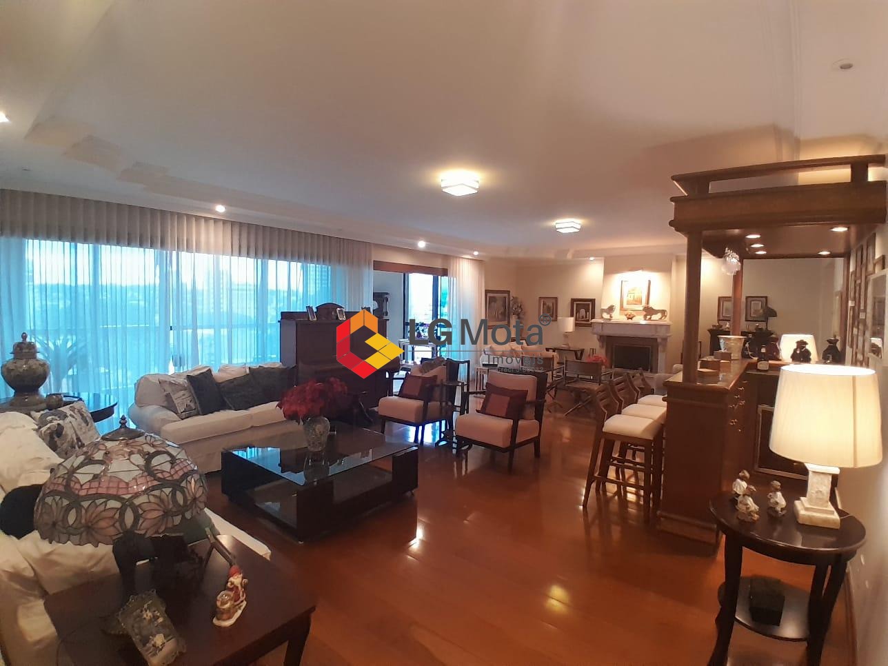 Composto por um living para 2 ambientes com lareira e bar e uma varanda fechada com vidros, escritório planejado com varanda, lavabo todo em granito, sala de TV, sala de jantar, sala de almoço, cozinha planejada, despensa, lavanderia completa de armários e 2 quartos e 1 banheiro de serviço.