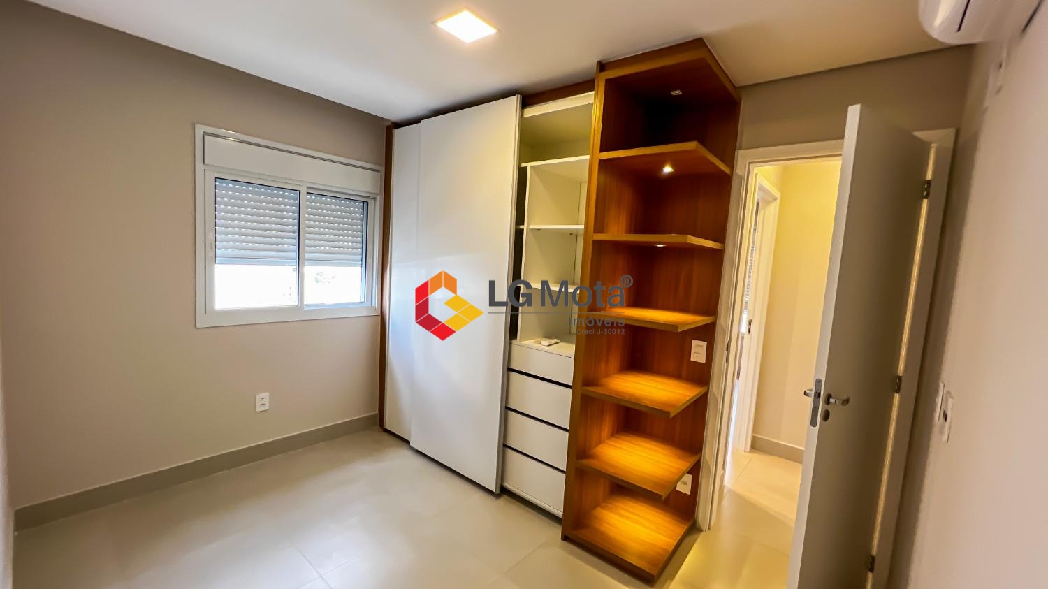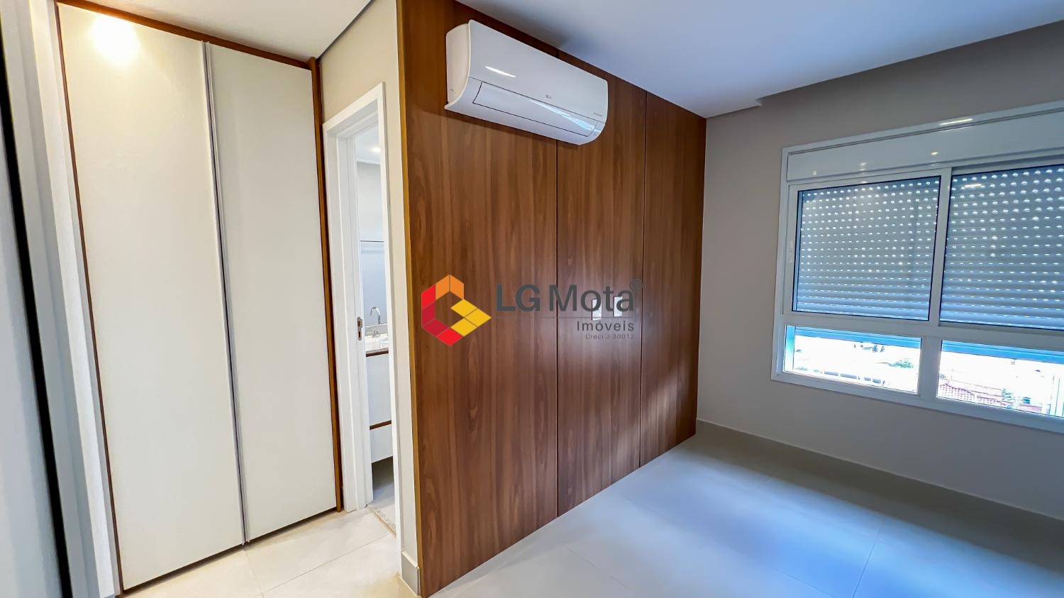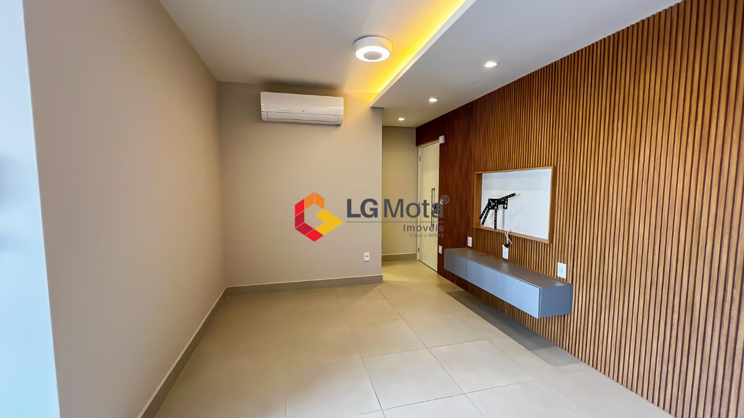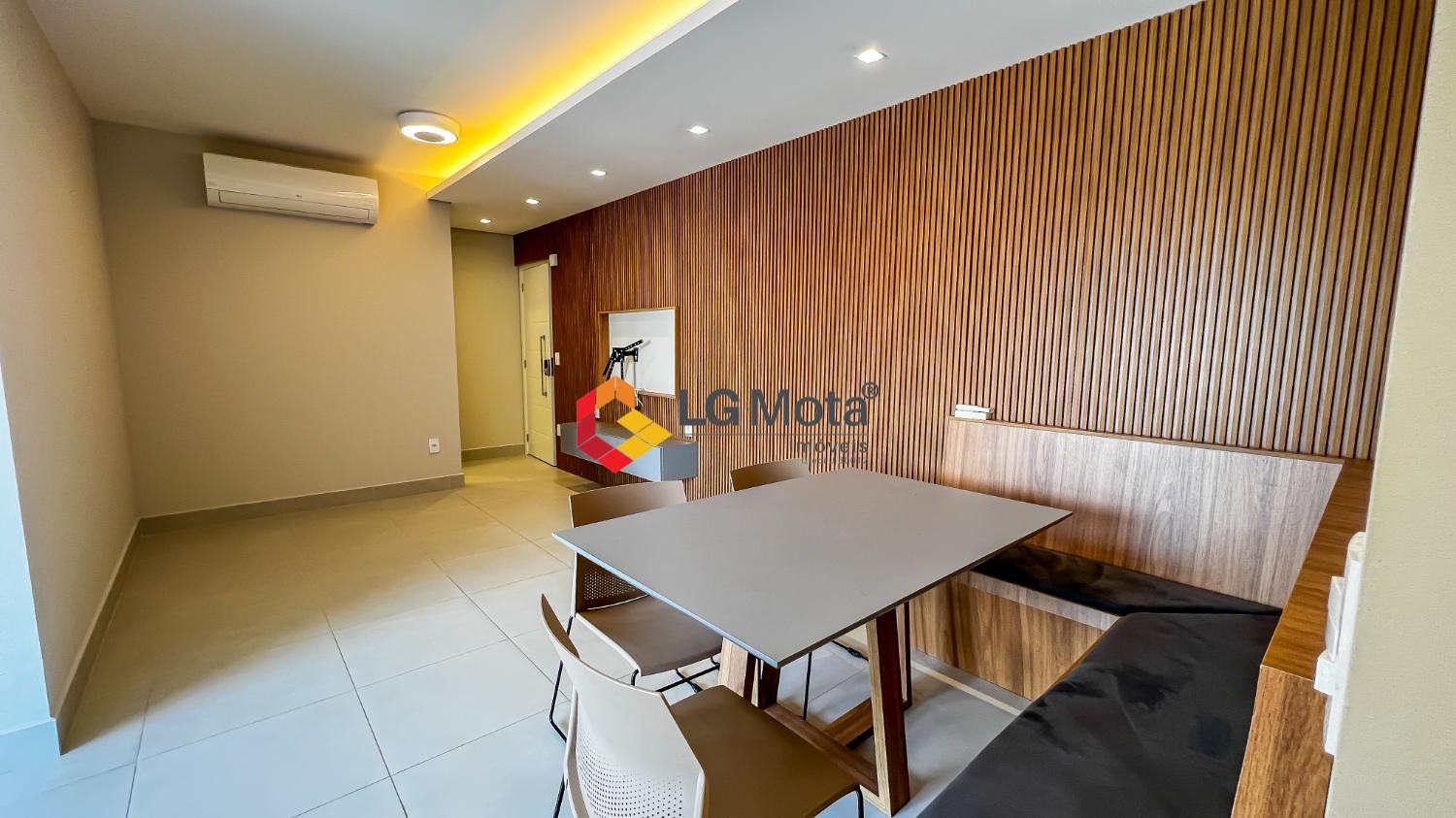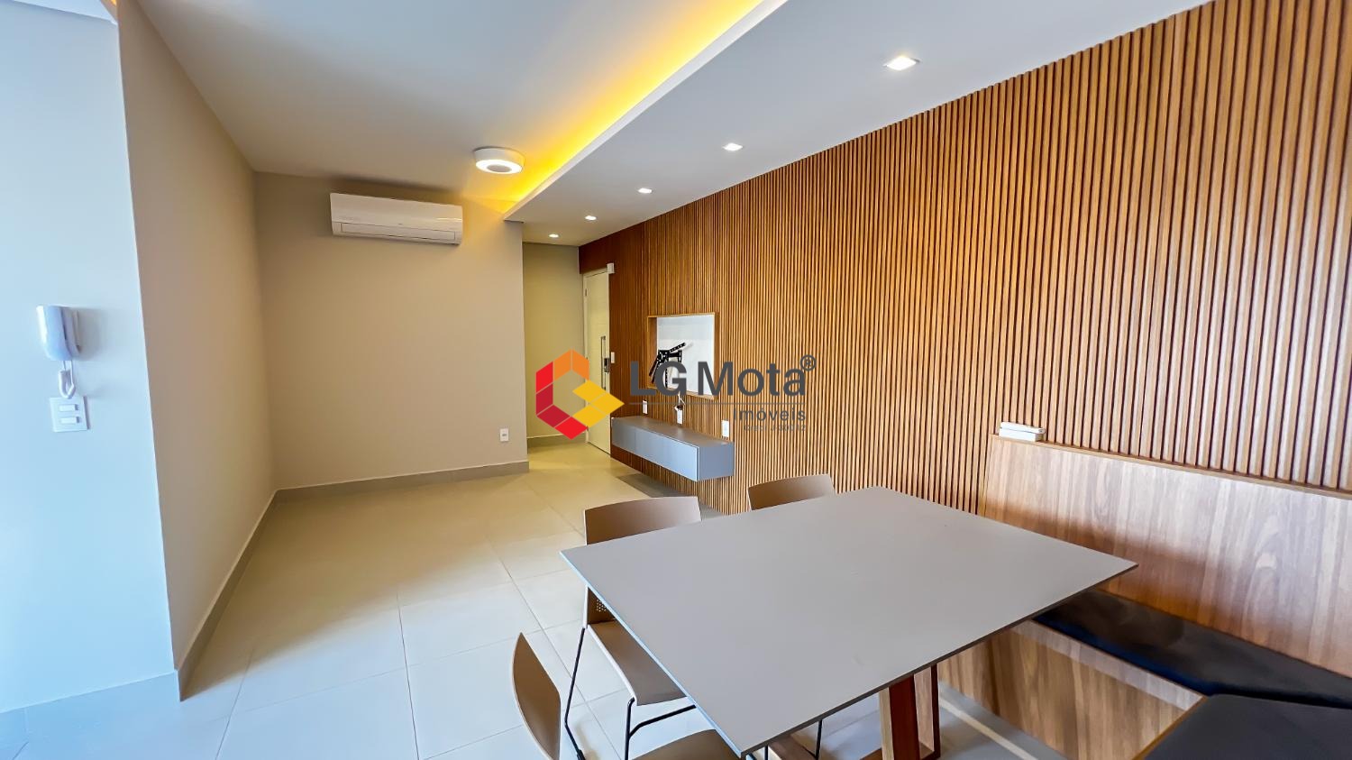 Living ampliado com painel para TV ripado em toda a extensão da parede, mesa de jantar, as duas suítes com armários, suíte master com closet, aparelho de ar no living e nas duas suítes.