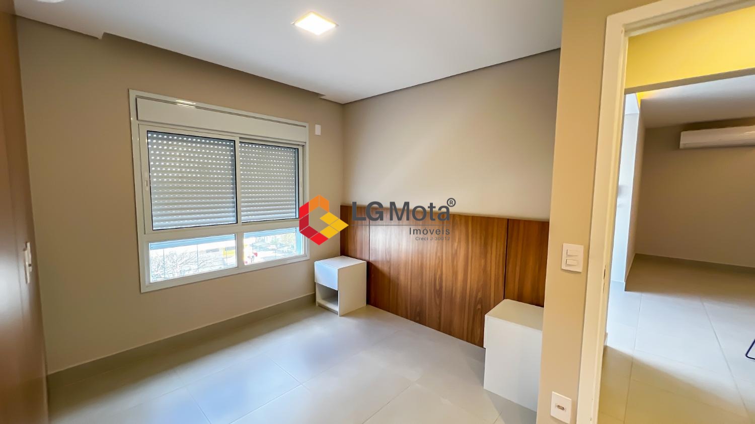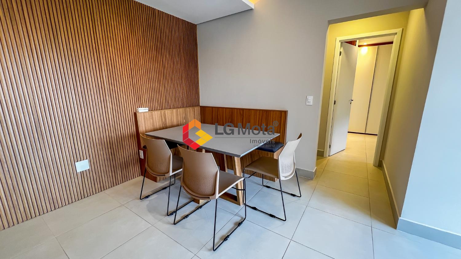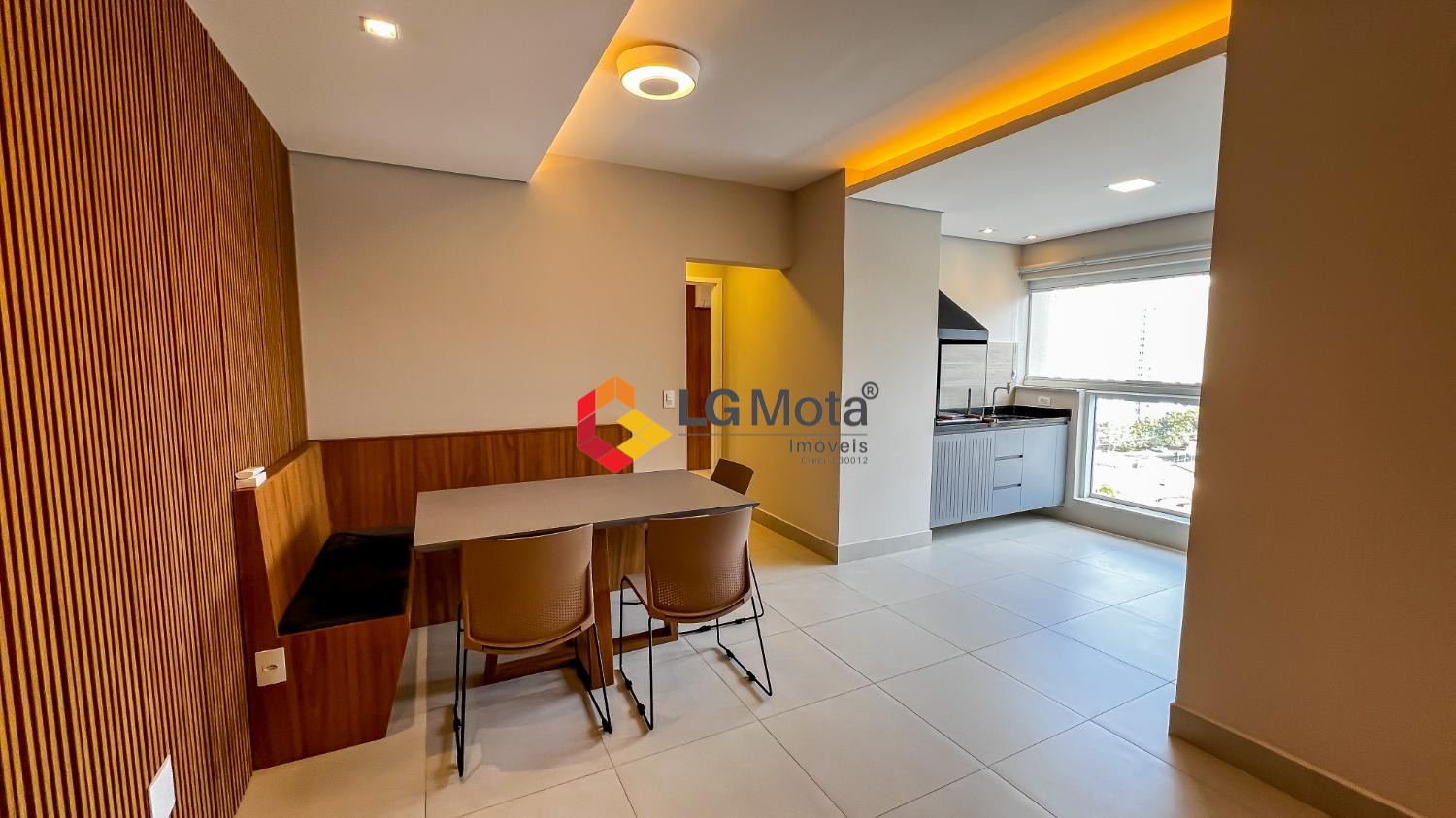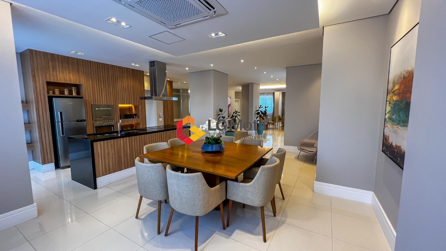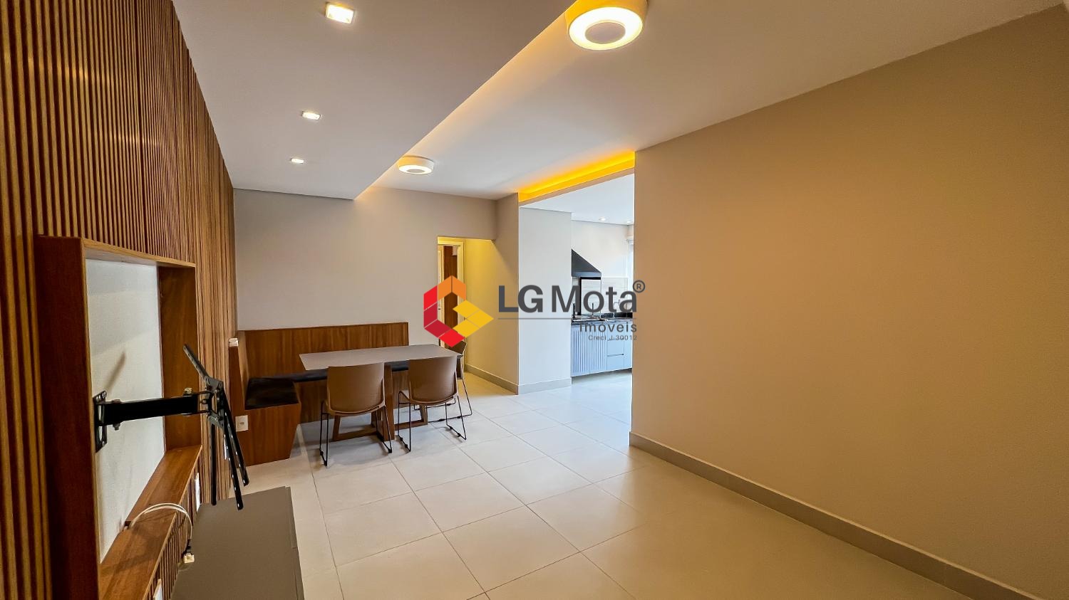 Living ampliado com painel para TV ripado em toda a extensão da parede, mesa de jantar, as duas suítes com armários, suíte master com closet, aparelho de ar no living e nas duas suítes.