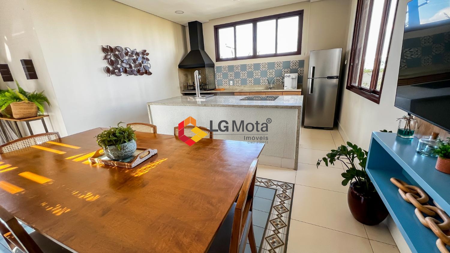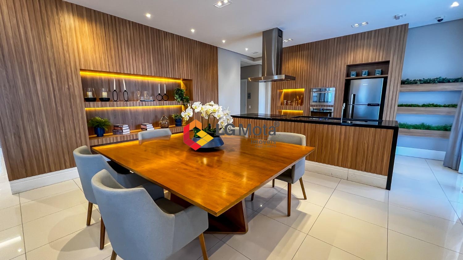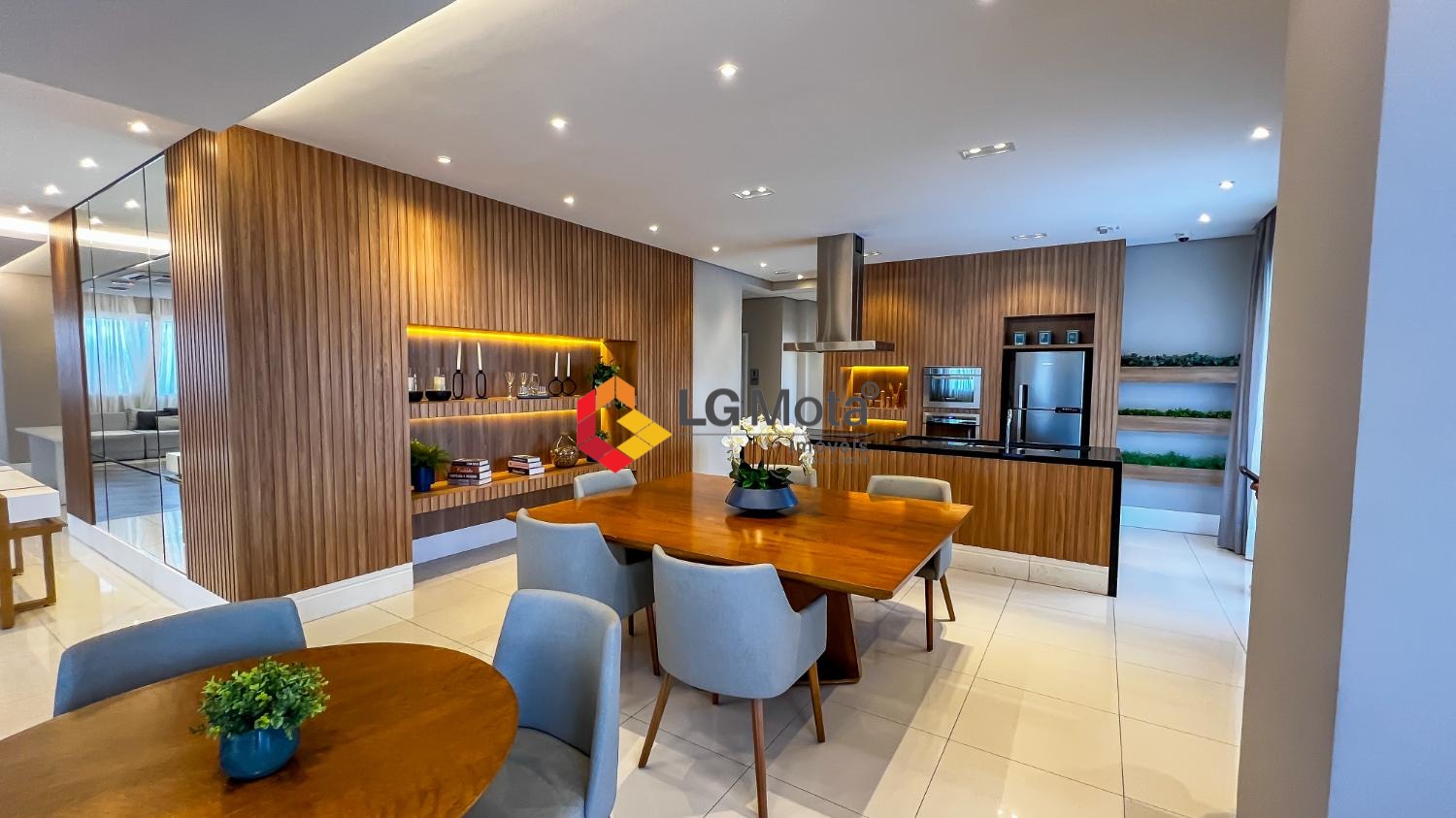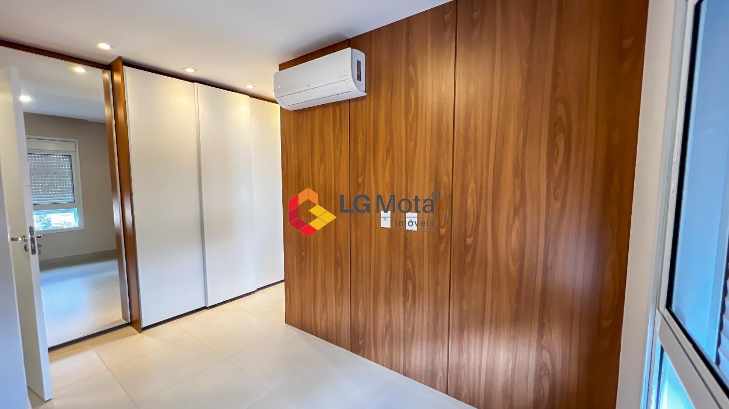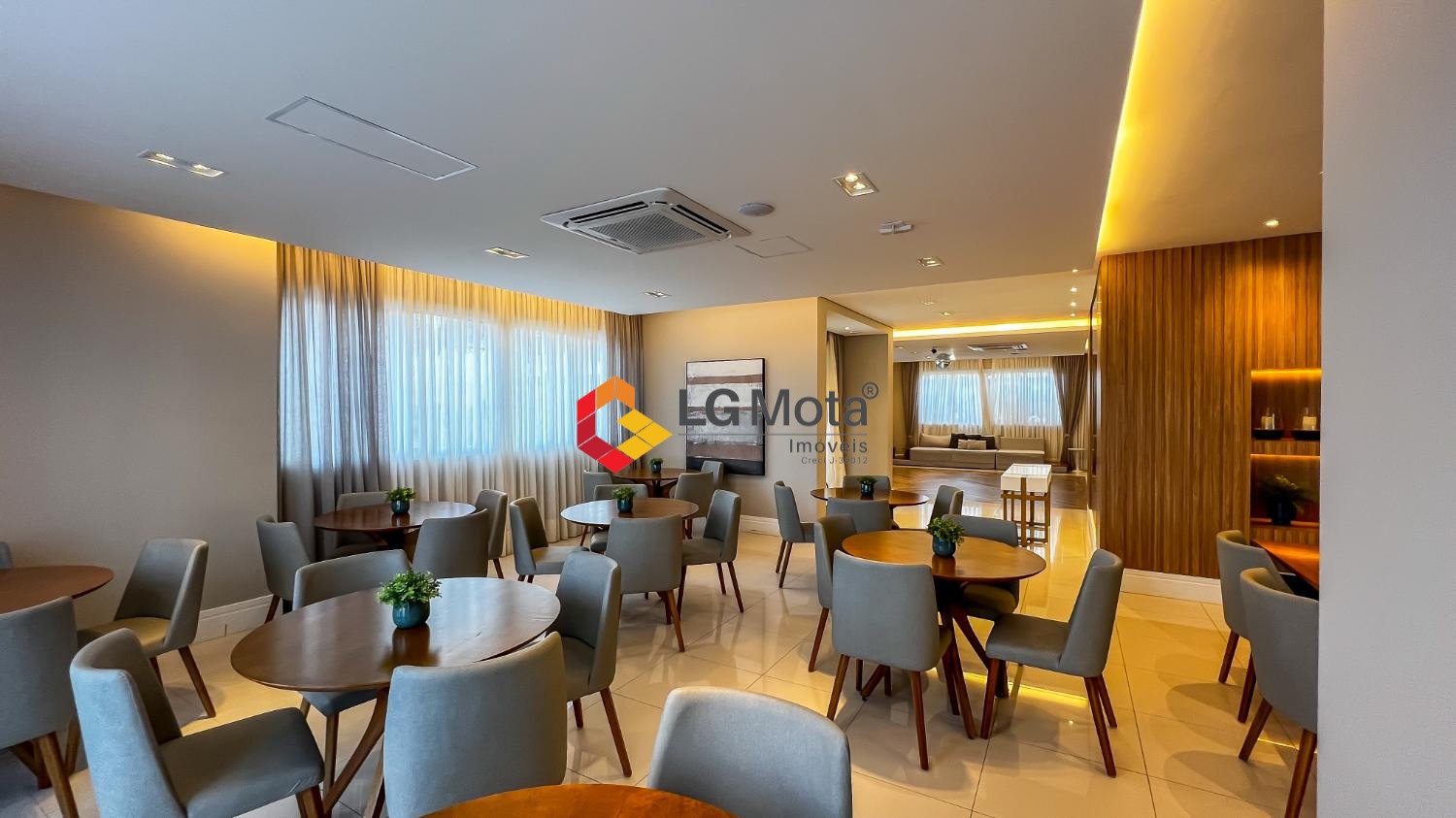 Living ampliado com painel para TV ripado em toda a extensão da parede, mesa de jantar, as duas suítes com armários, suíte master com closet, aparelho de ar no living e nas duas suítes.
