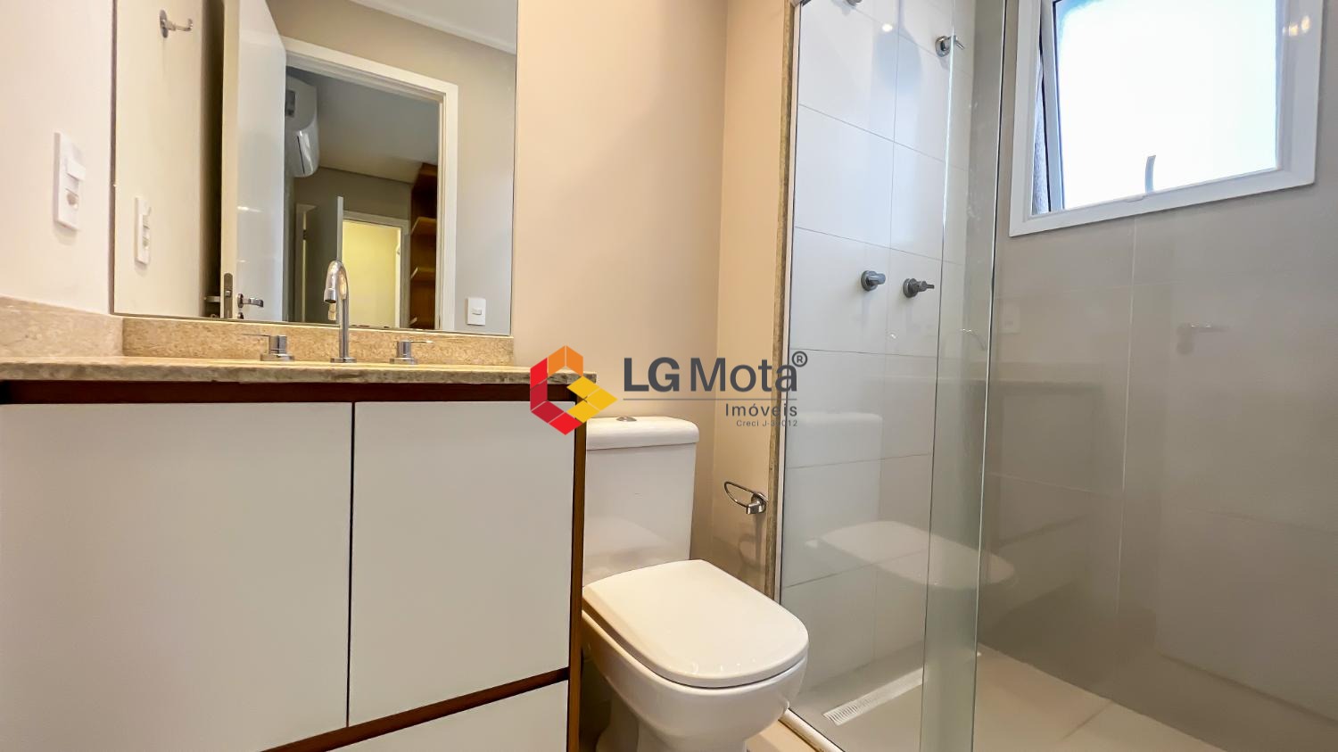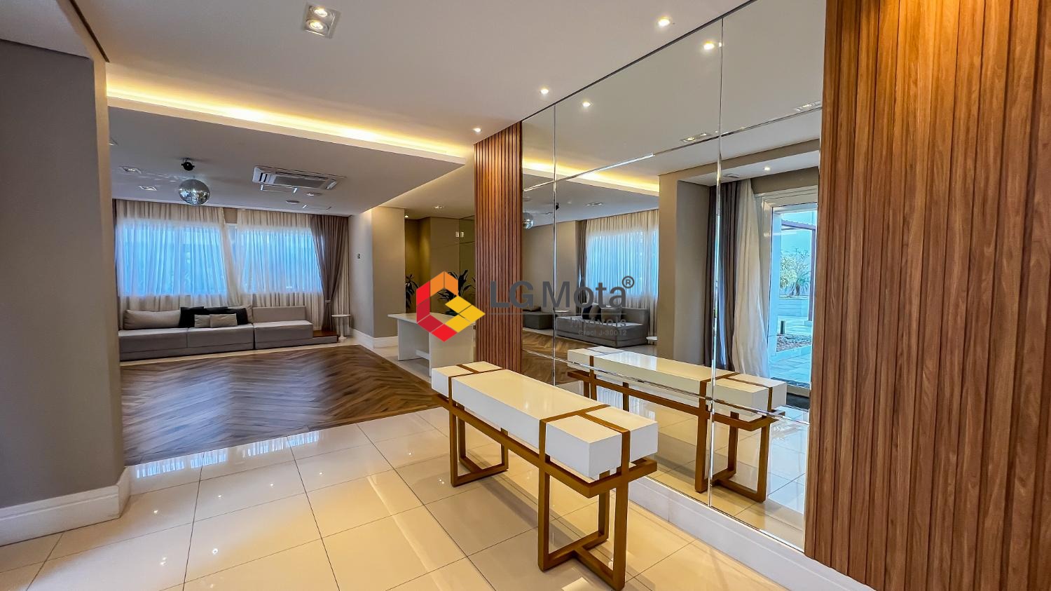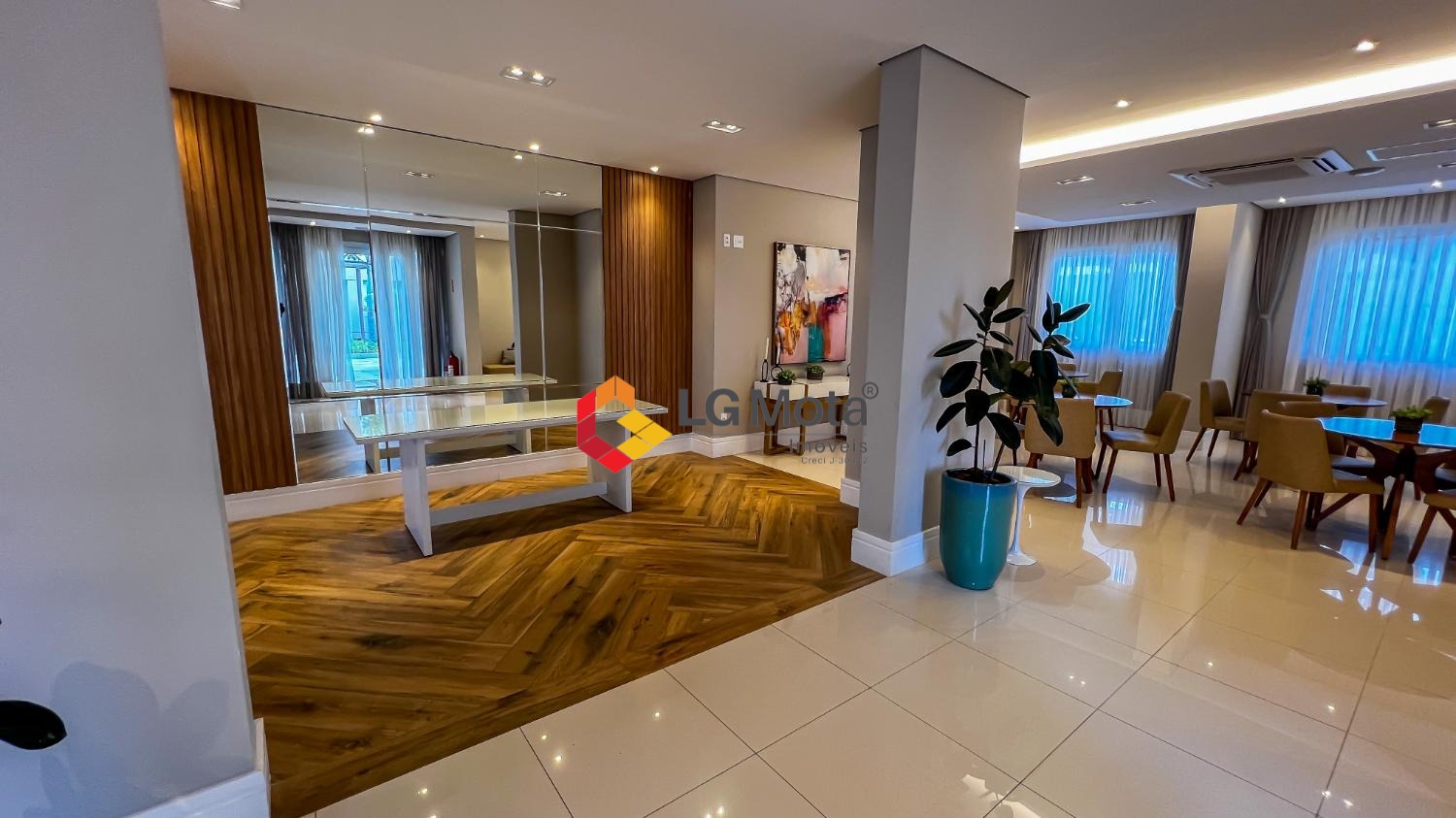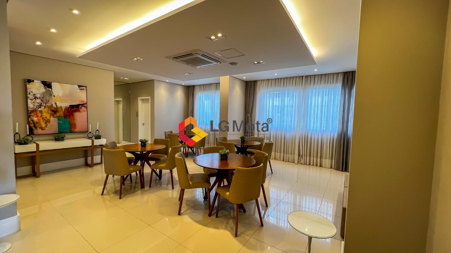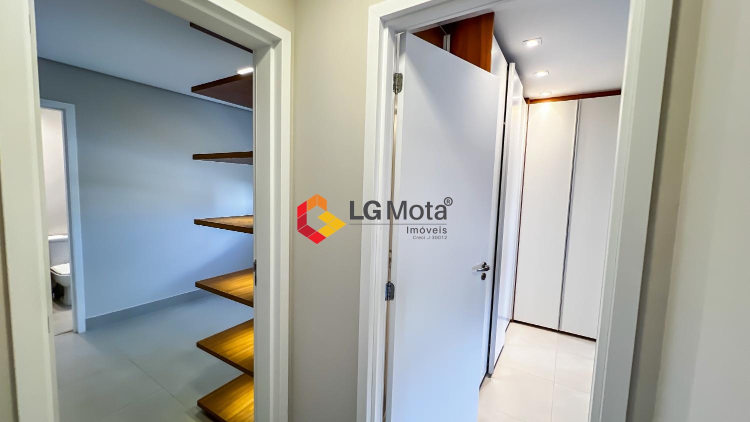 Living ampliado com painel para TV ripado em toda a extensão da parede, mesa de jantar, as duas suítes com armários, suíte master com closet, aparelho de ar no living e nas duas suítes.