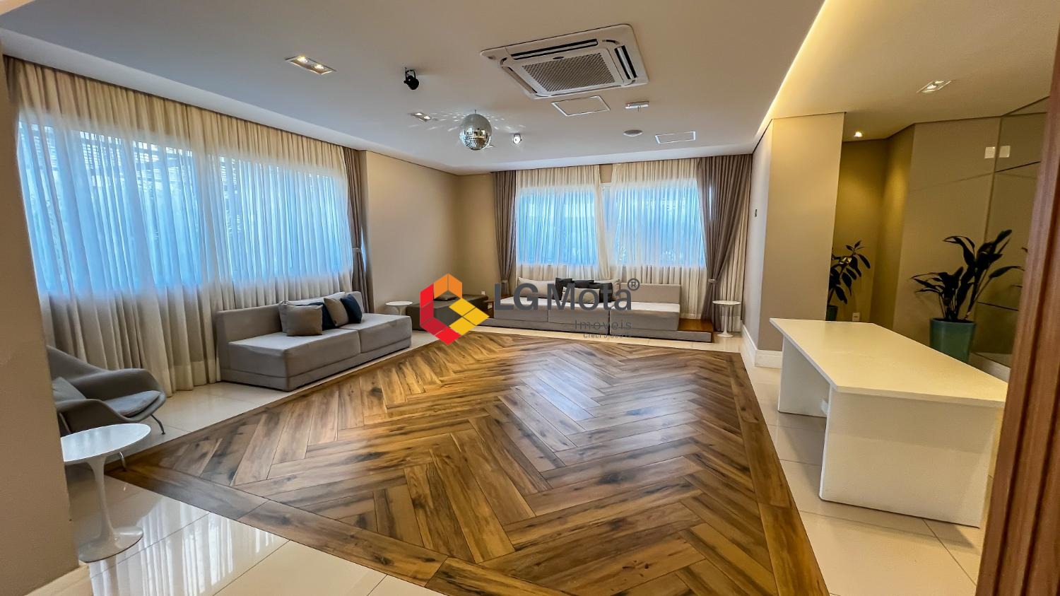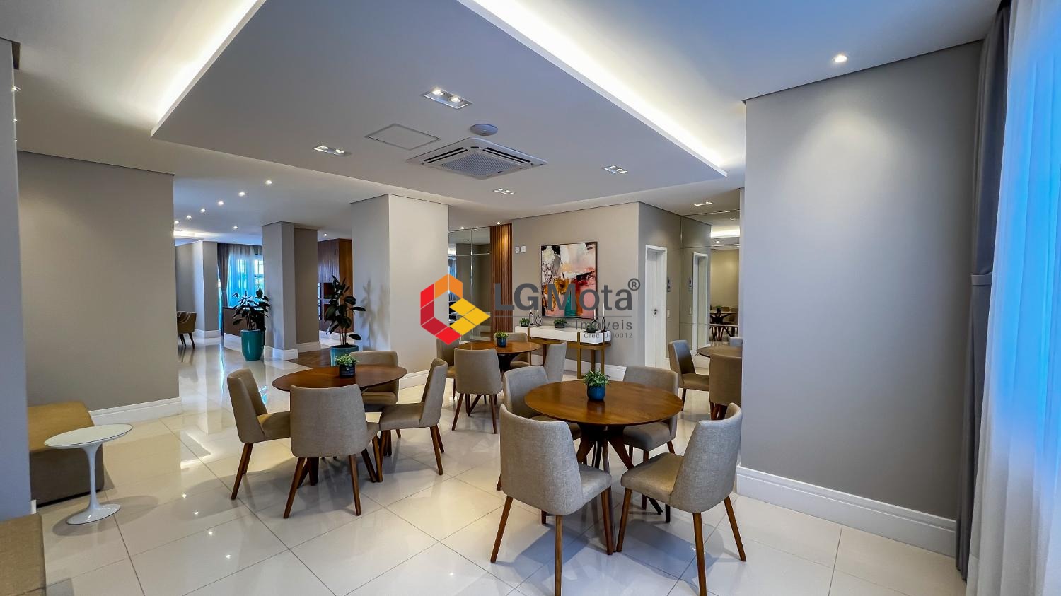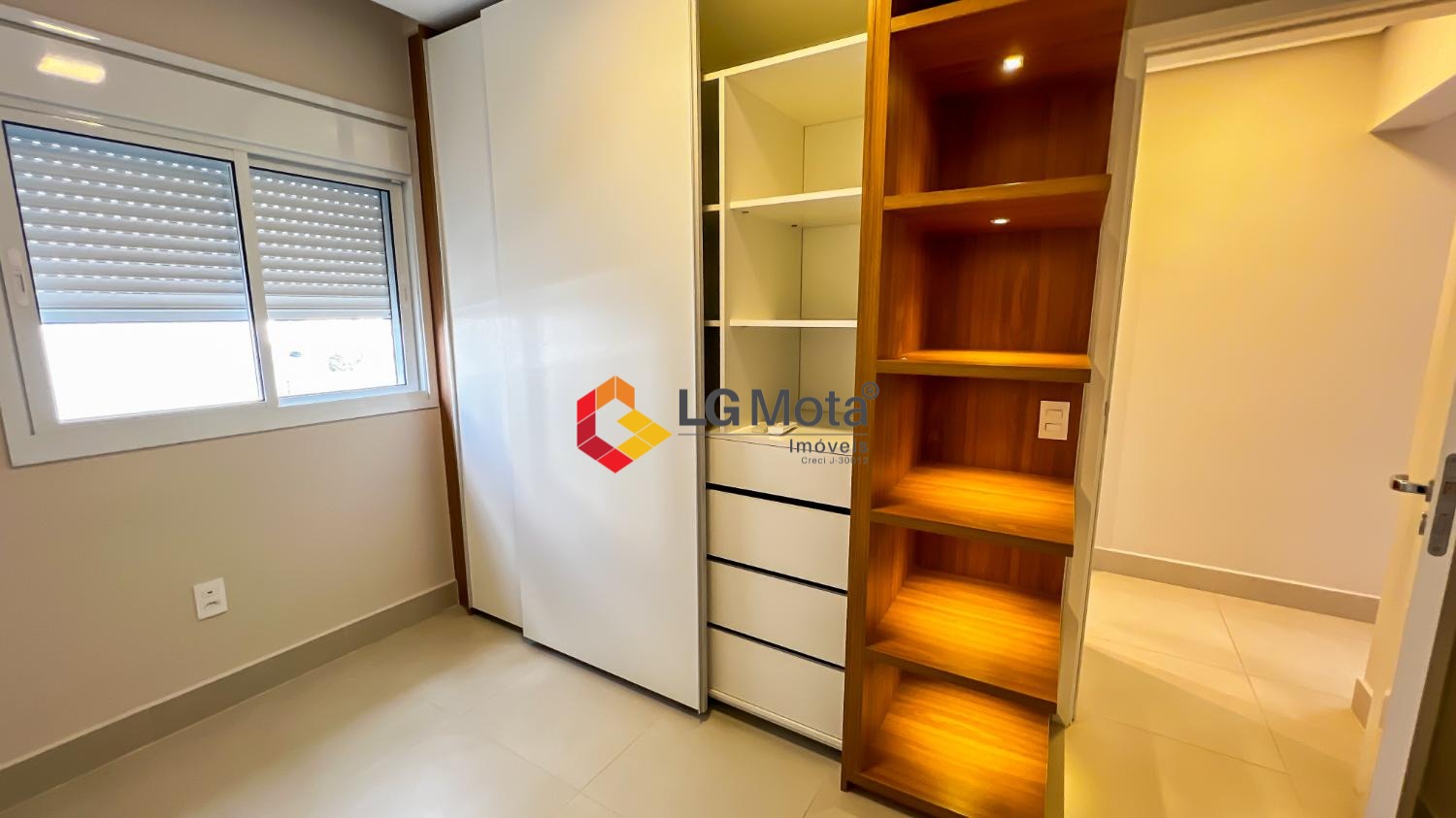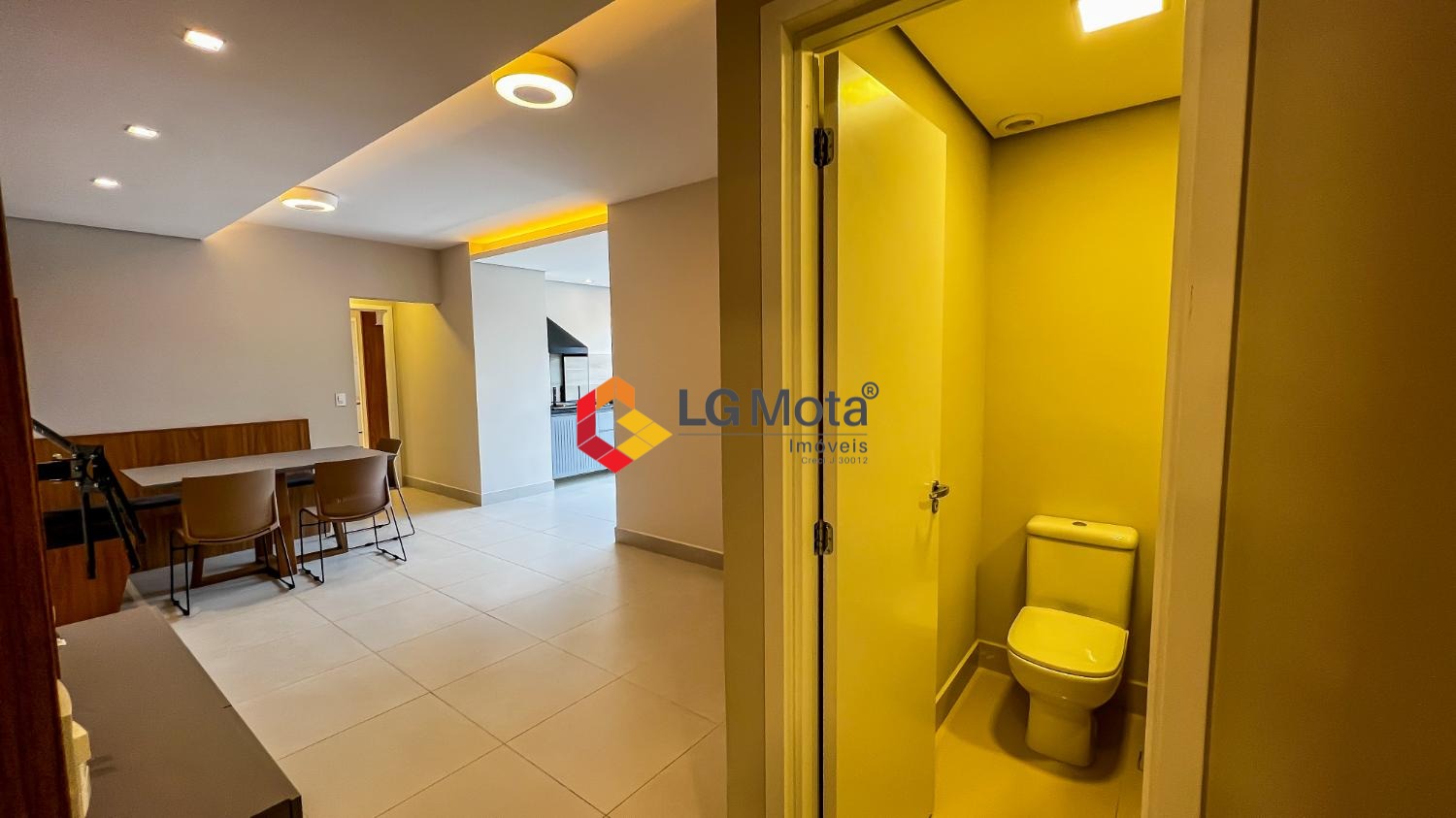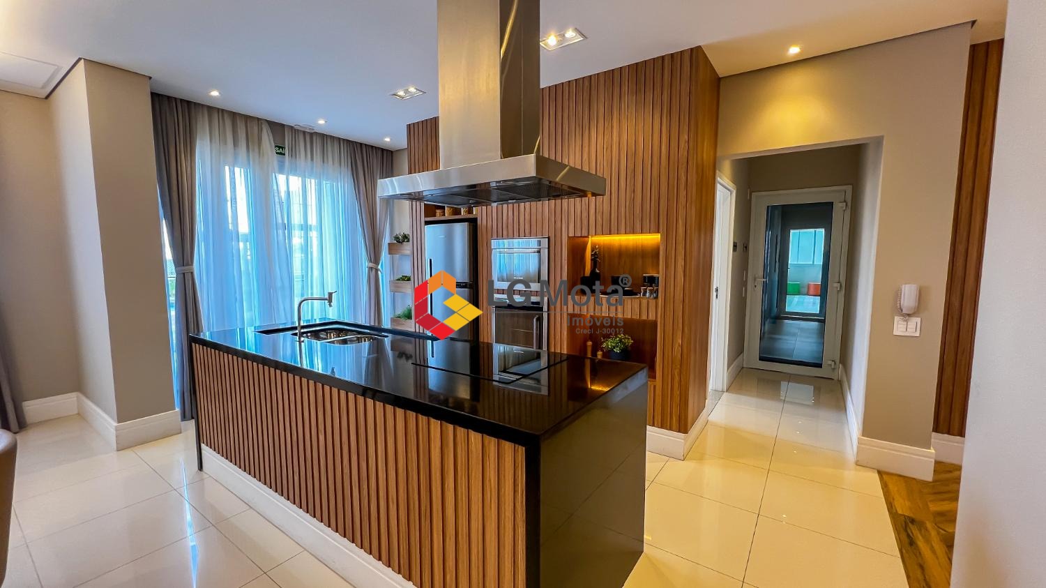 Living ampliado com painel para TV ripado em toda a extensão da parede, mesa de jantar, as duas suítes com armários, suíte master com closet, aparelho de ar no living e nas duas suítes.