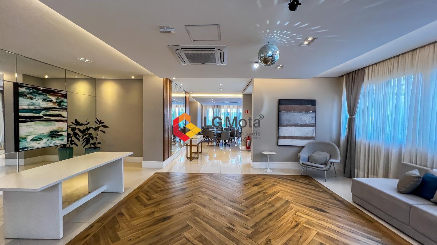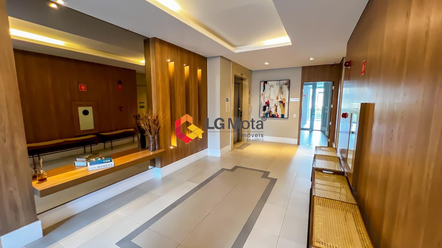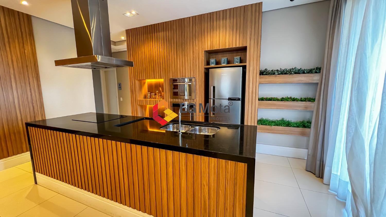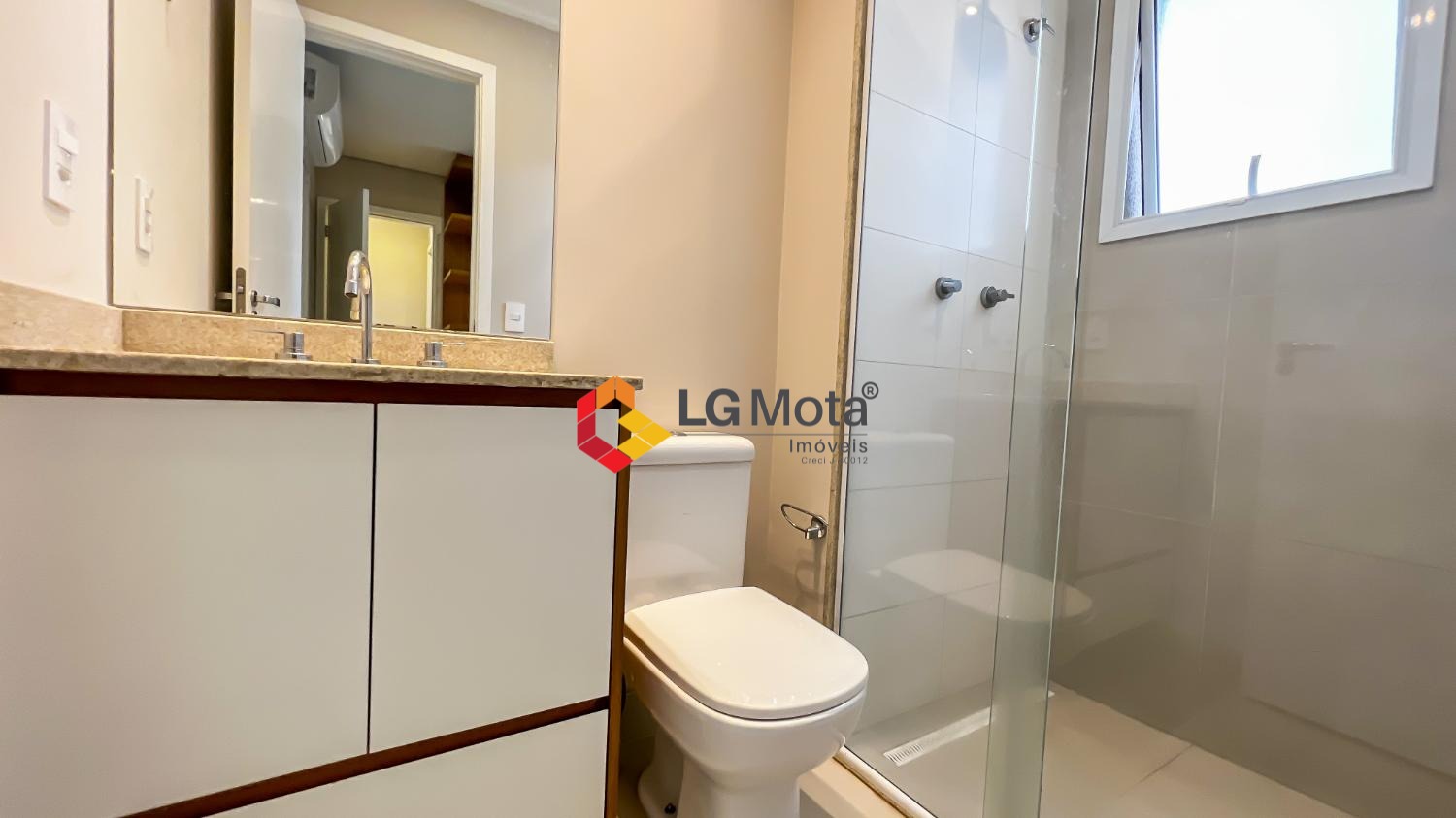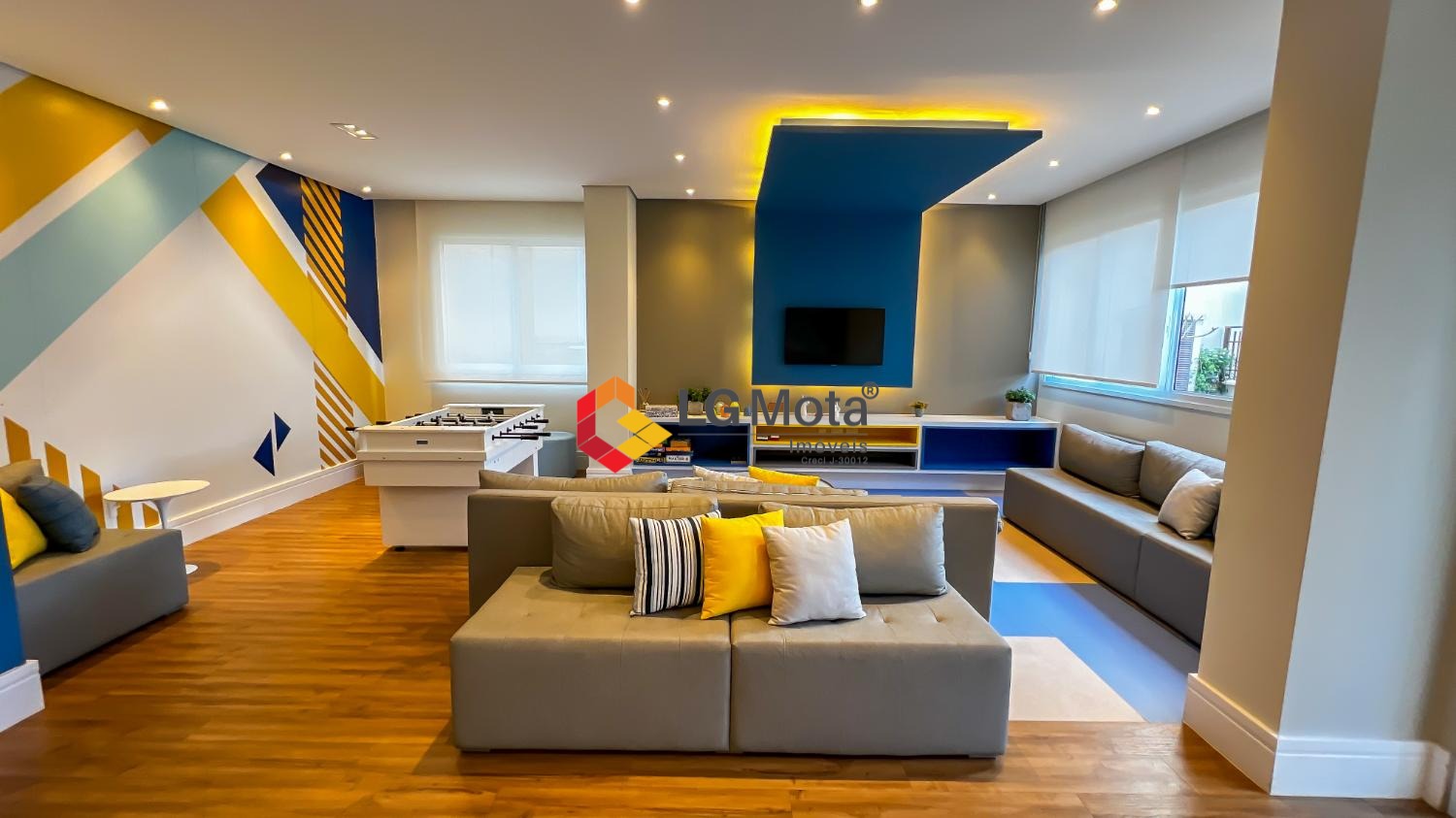 Living ampliado com painel para TV ripado em toda a extensão da parede, mesa de jantar, as duas suítes com armários, suíte master com closet, aparelho de ar no living e nas duas suítes.
