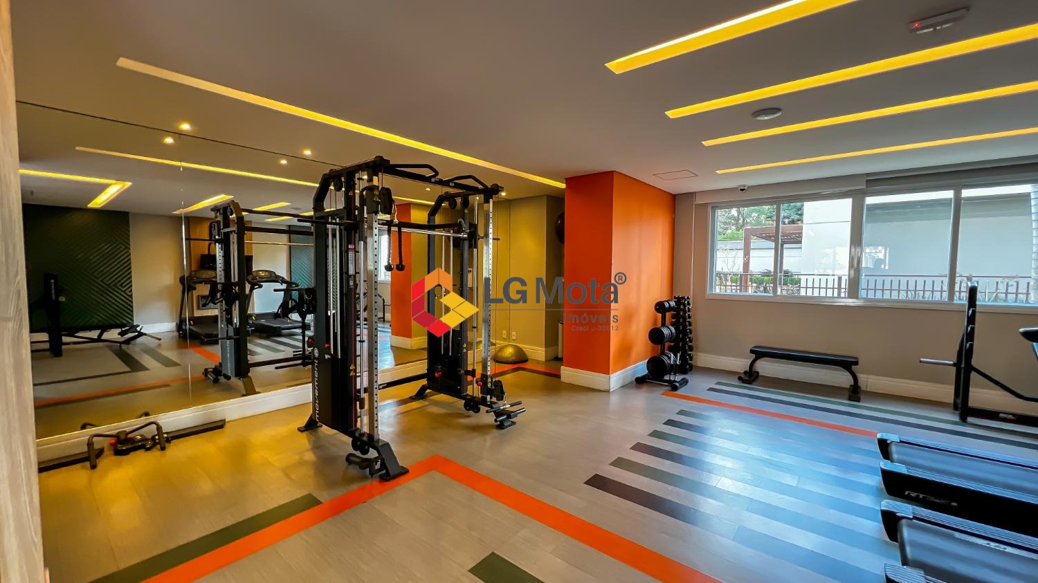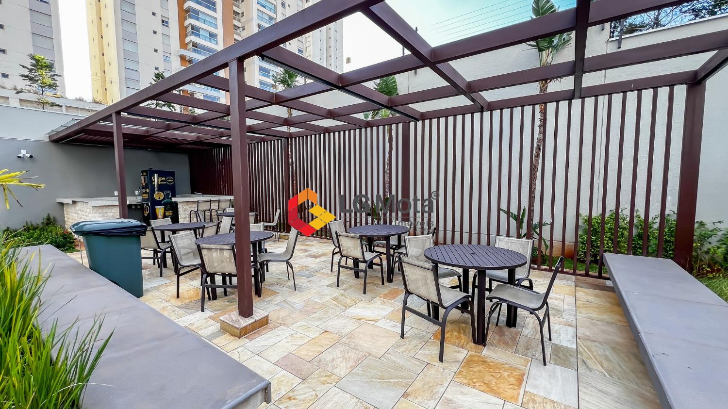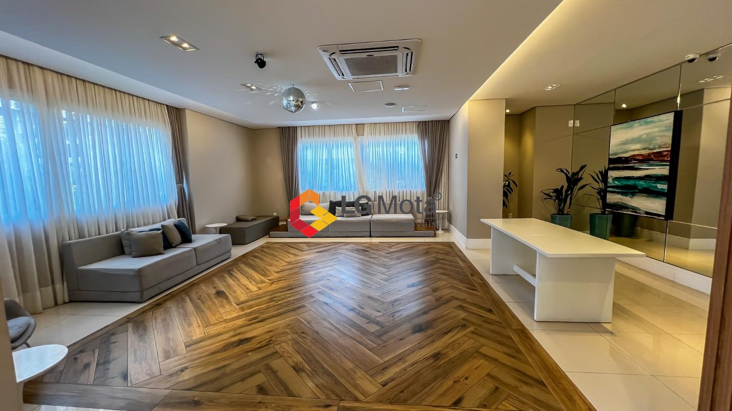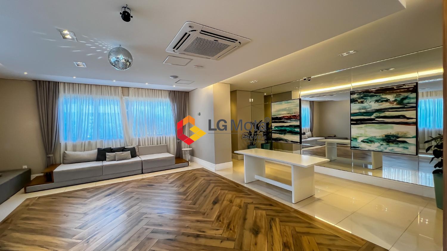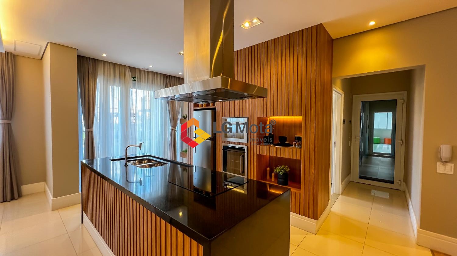 Living ampliado com painel para TV ripado em toda a extensão da parede, mesa de jantar, as duas suítes com armários, suíte master com closet, aparelho de ar no living e nas duas suítes.
