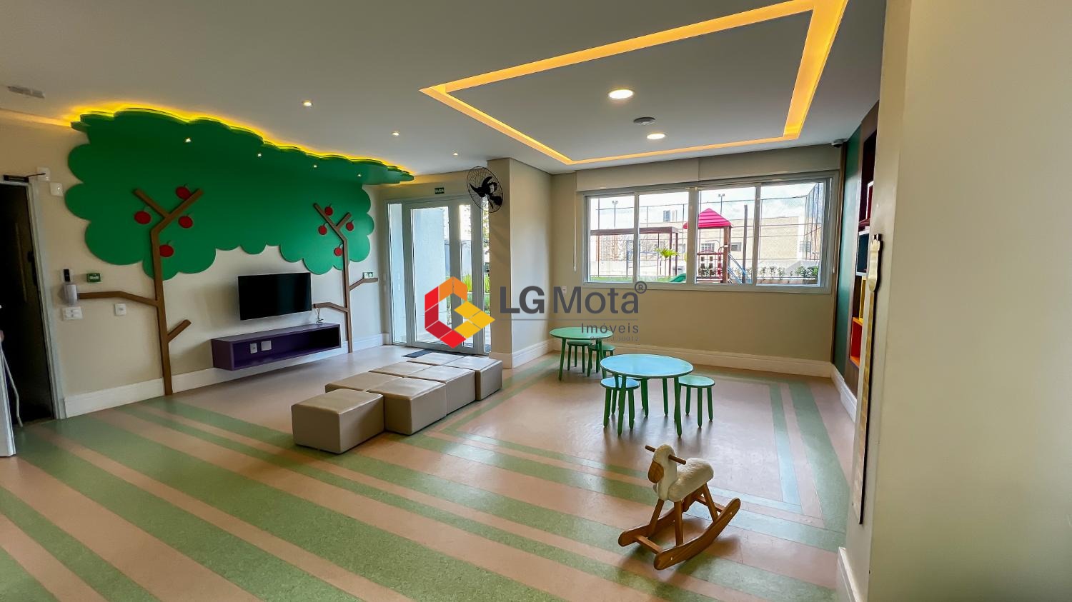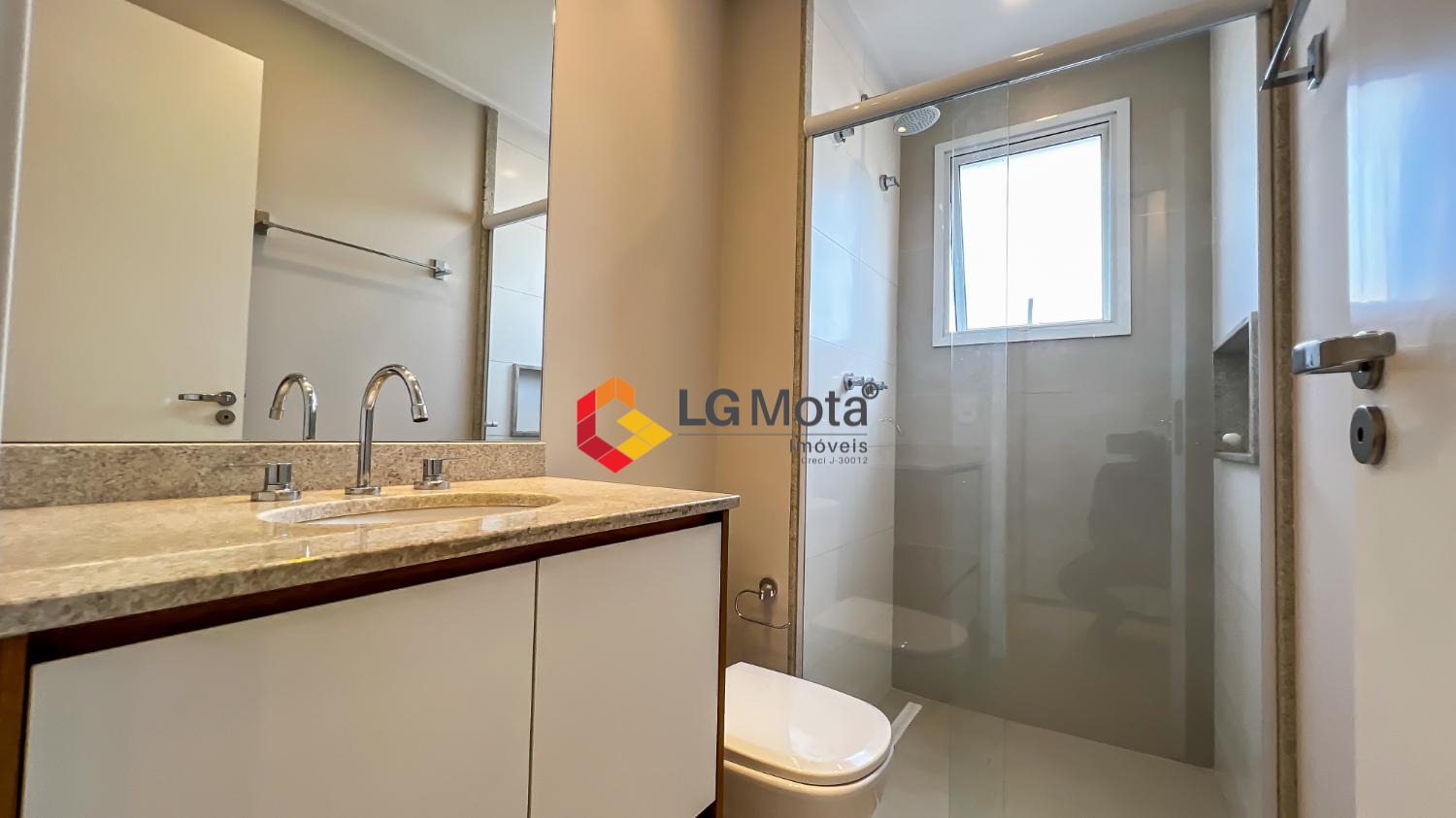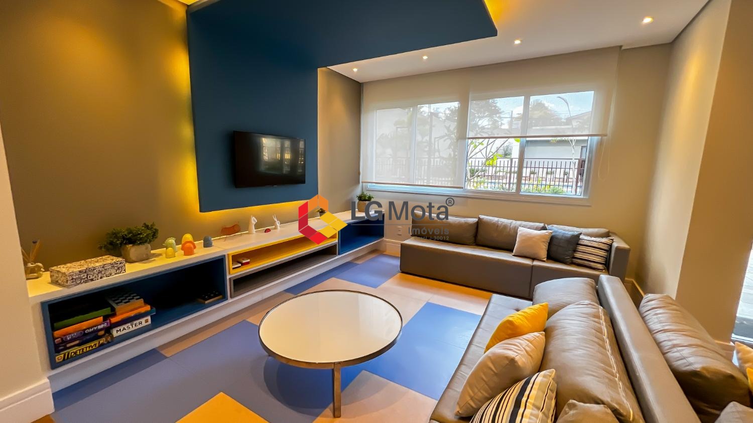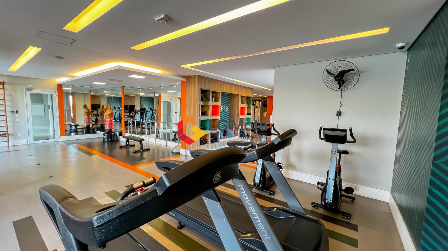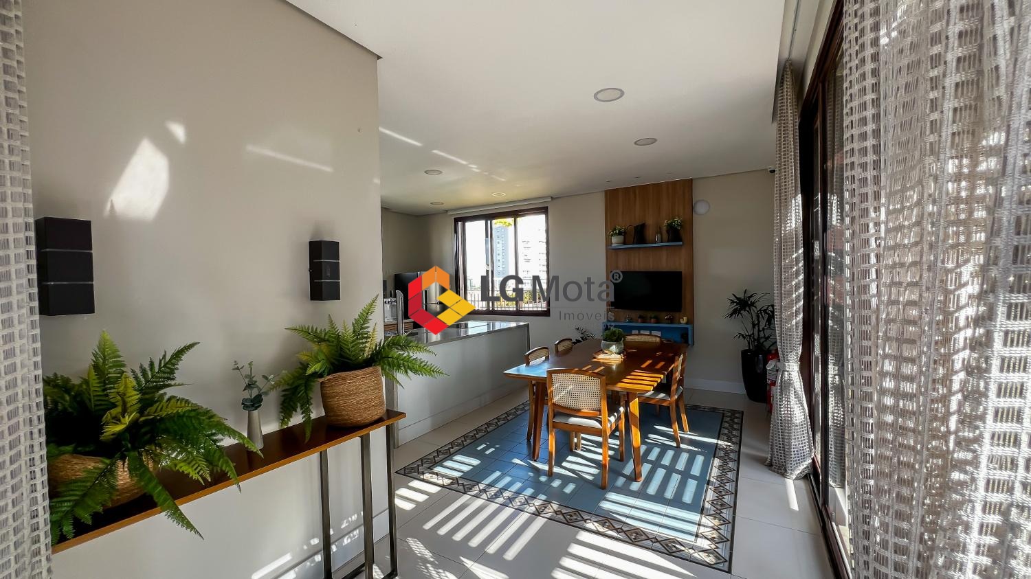Living ampliado com painel para TV ripado em toda a extensão da parede, mesa de jantar, as duas suítes com armários, suíte master com closet, aparelho de ar no living e nas duas suítes.
