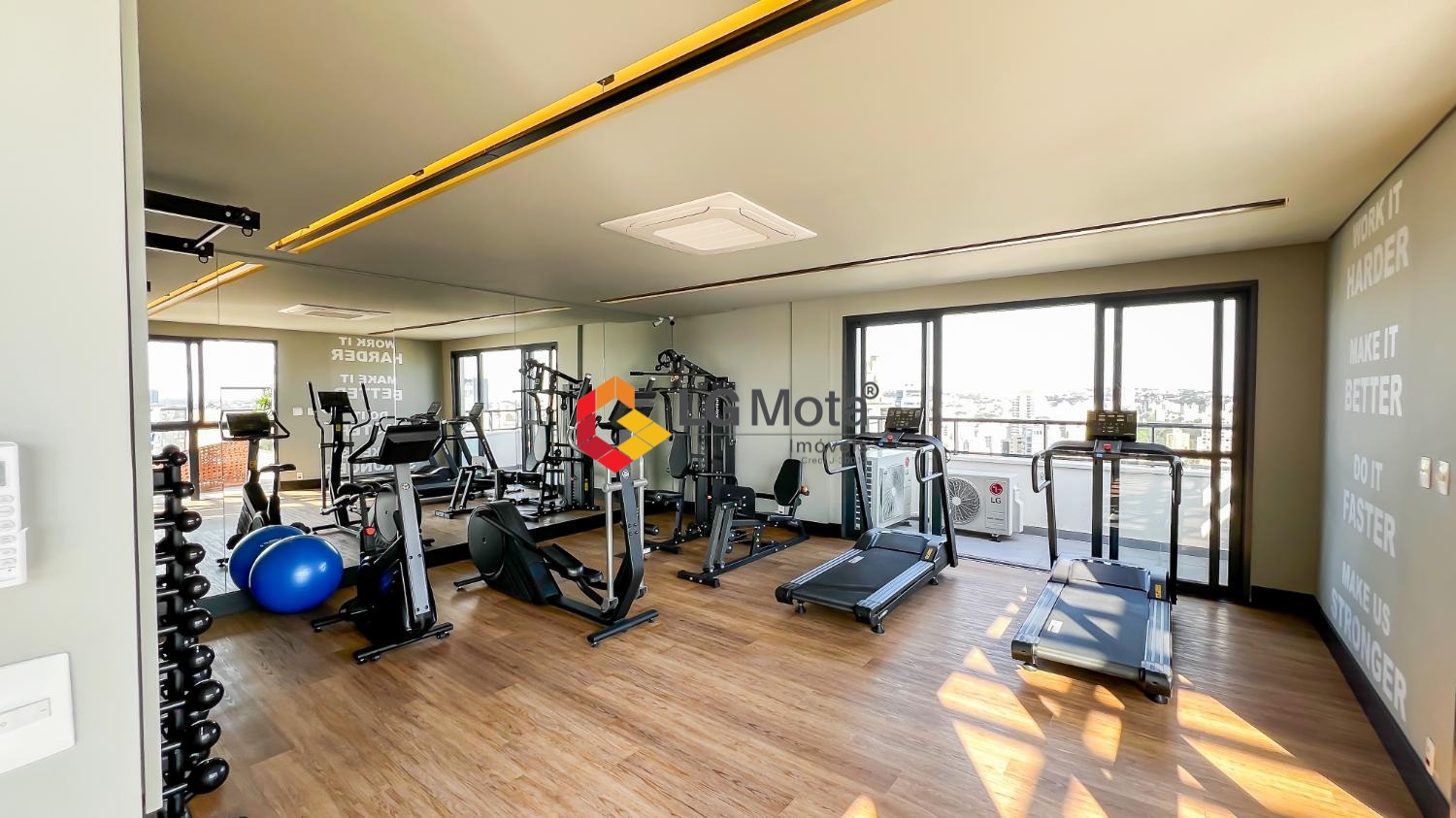 Sala com aparelho de ar condicionado, cozinha com armários planejados, geladeira, cooktop e microondas e dormitório com armários planejados, aparelho de ar condicionado, banheiro com box blindex.