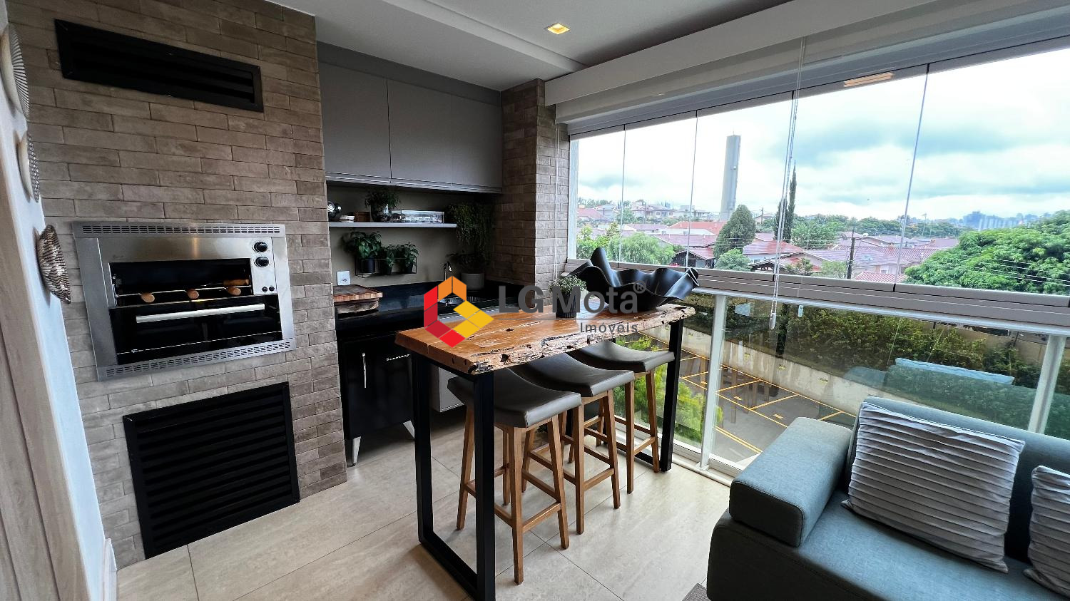 . Varanda integrada em piso nivelado, com churrasqueira a gás com fechamento de vidro e persianas de enrolar