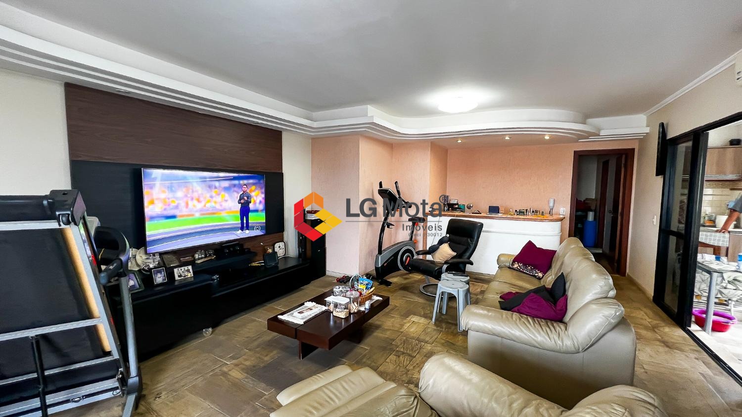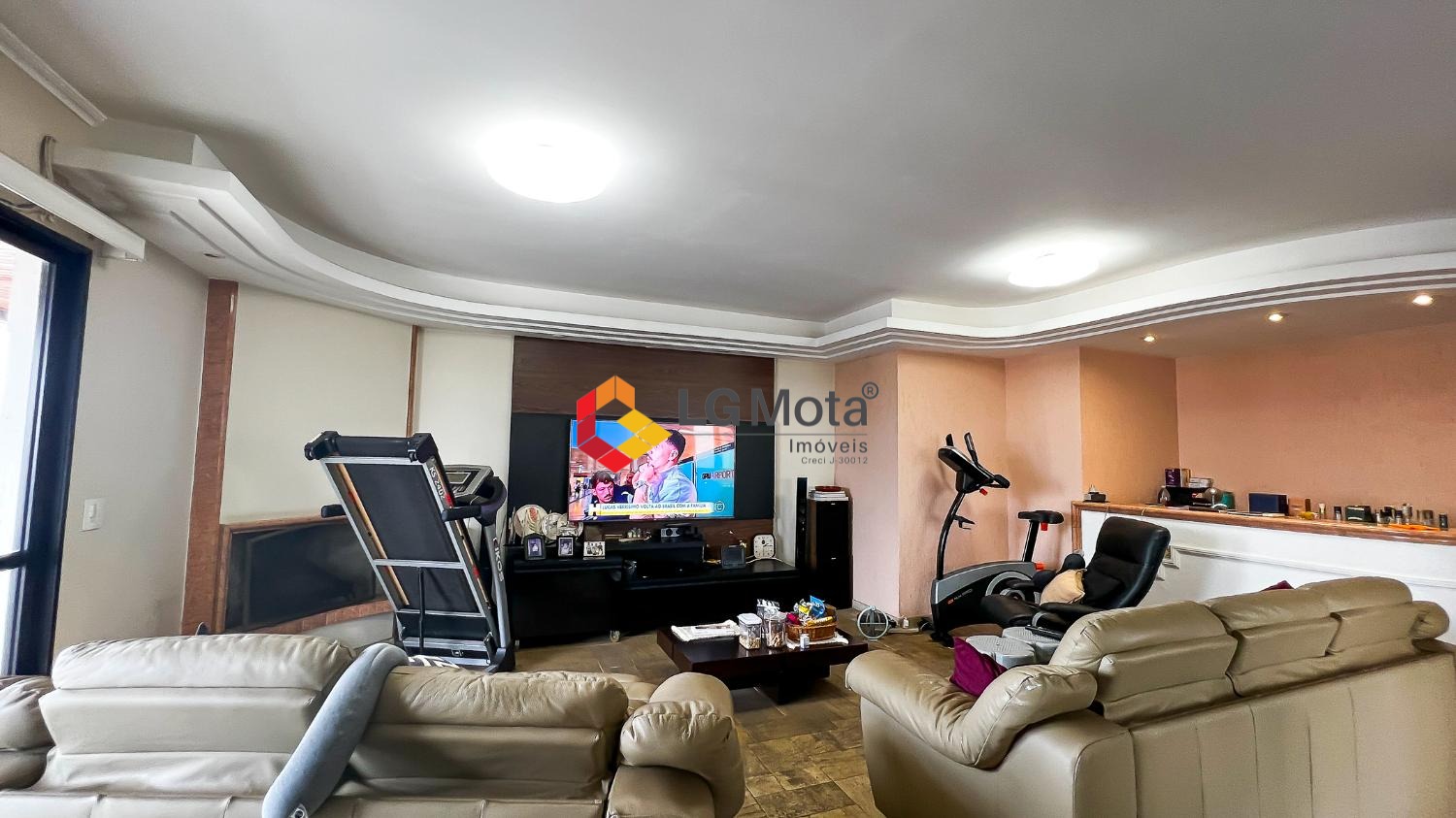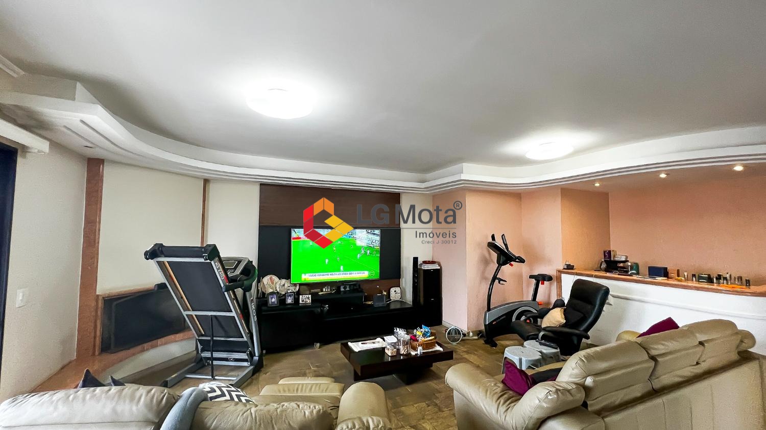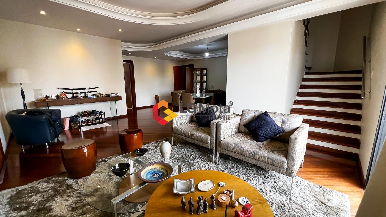 A área social conta com uma ampla sala para 2 ambientes, além de um grande diferencial: uma sala de TV independente no pavimento superior, com bar e lareira, perfeita para momentos de convivência e com mais privacidade.