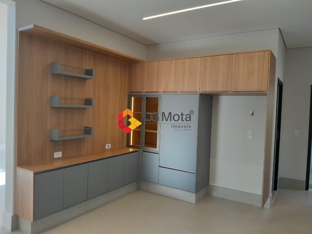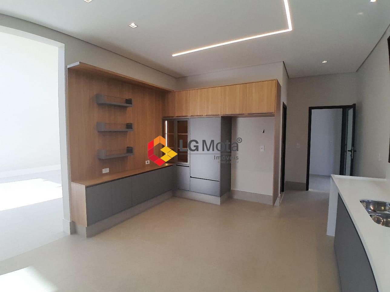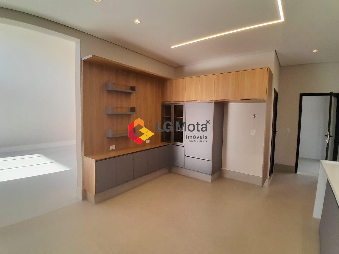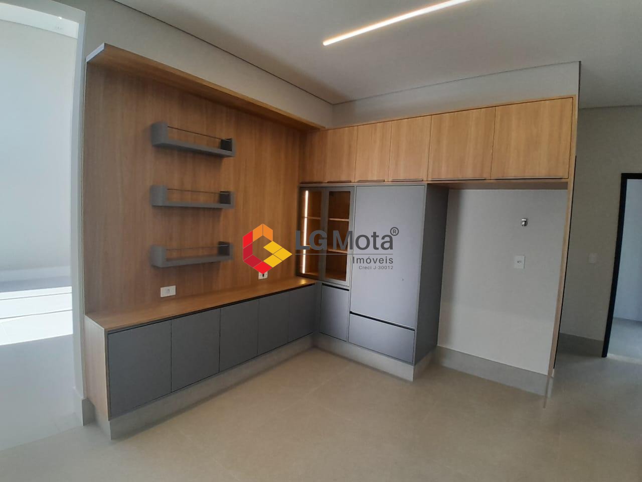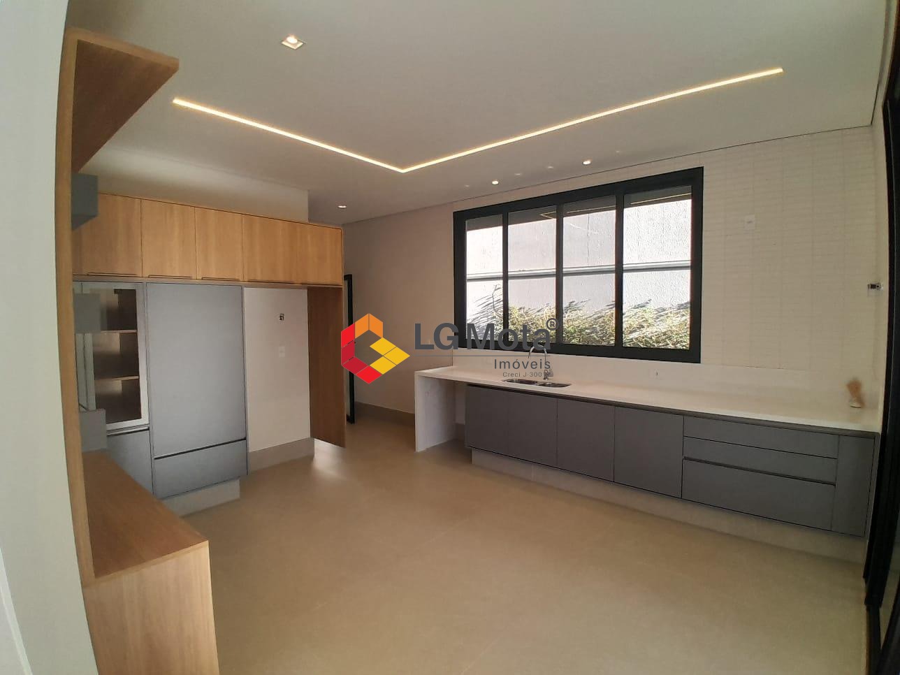 Sala de TV com teto rebaixado e um living amplo com pé direito alto, escritório e lavabo, piso porcelanato.