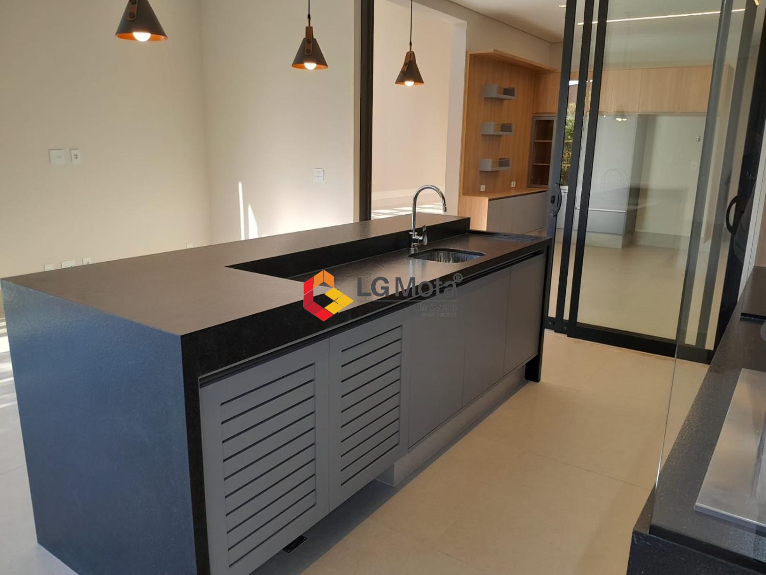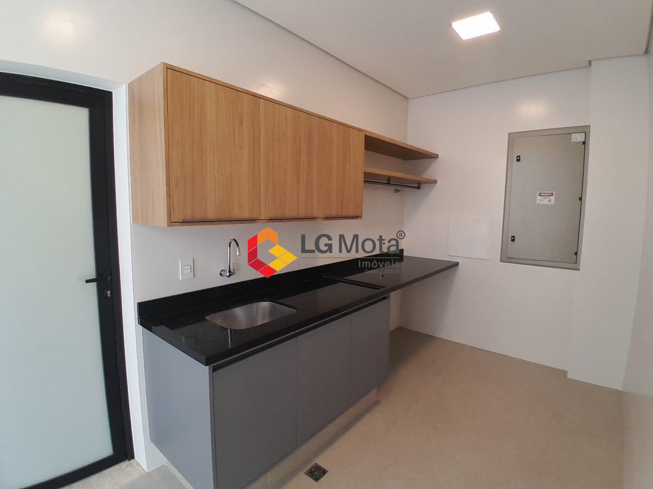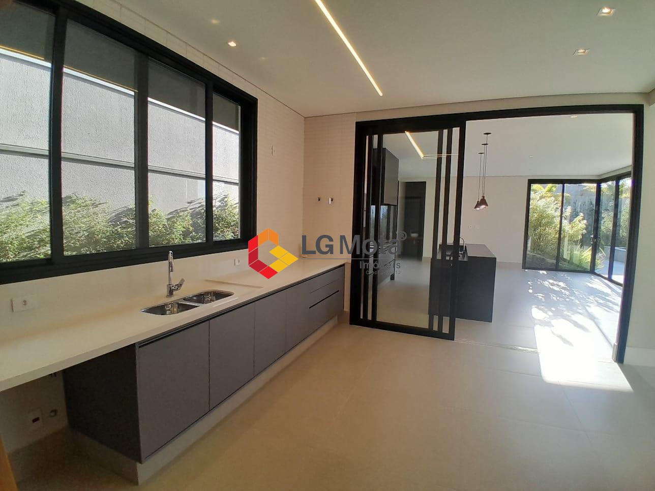 Cozinha espaçosa com 2 cubas, despensa, área de serviço, piso porcelanato fosco.