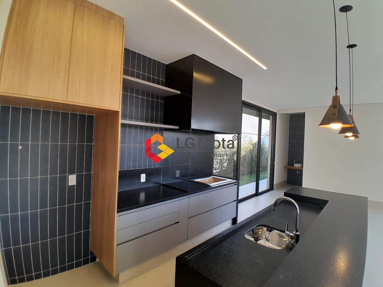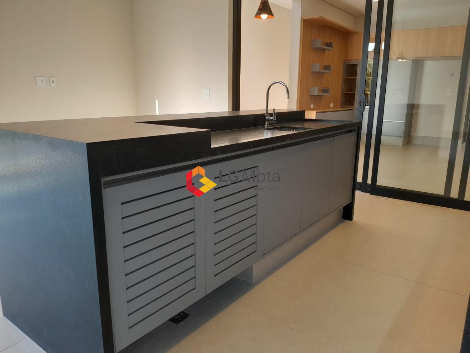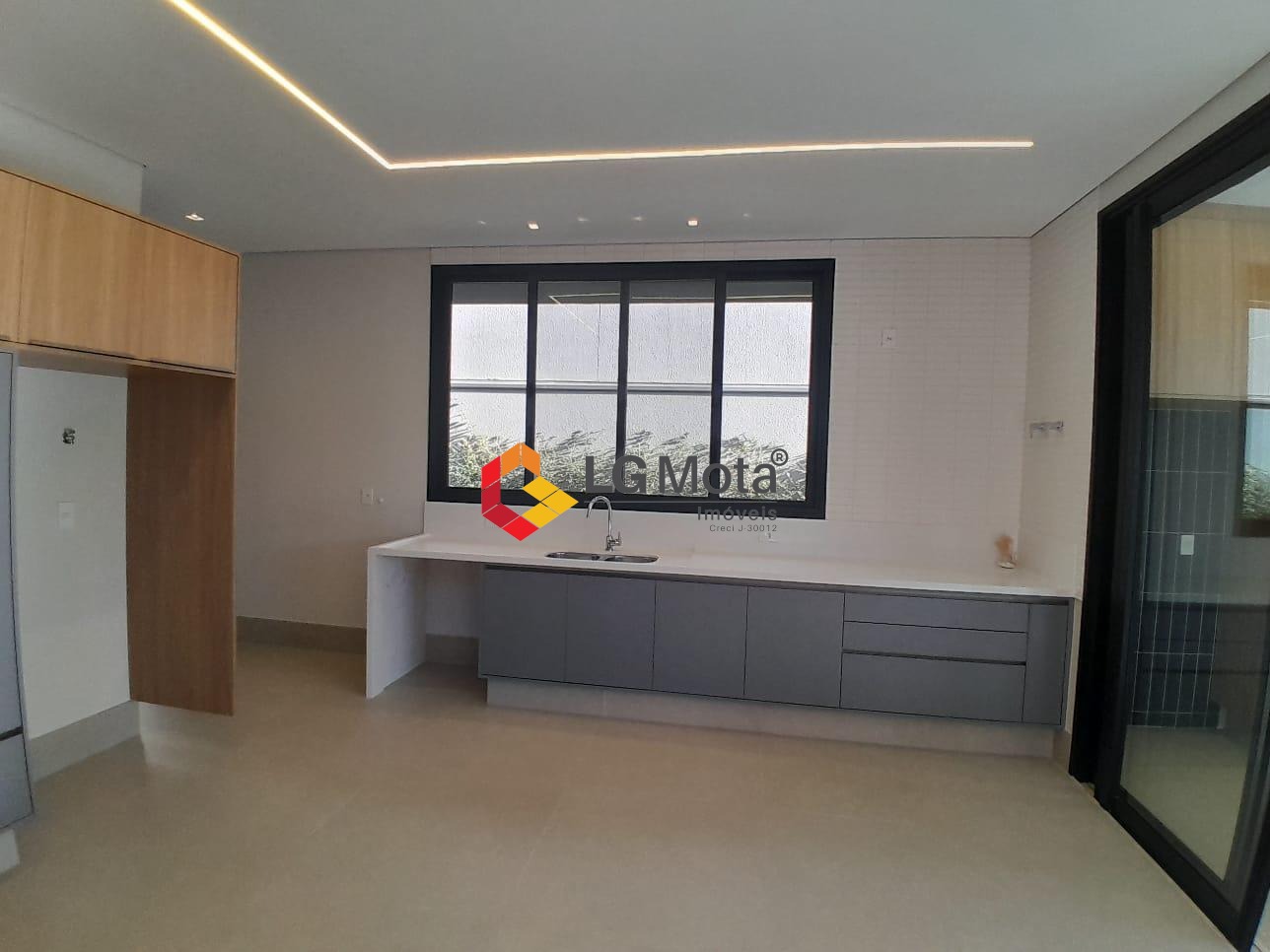 Cozinha espaçosa com 2 cubas, despensa, área de serviço, piso porcelanato fosco.