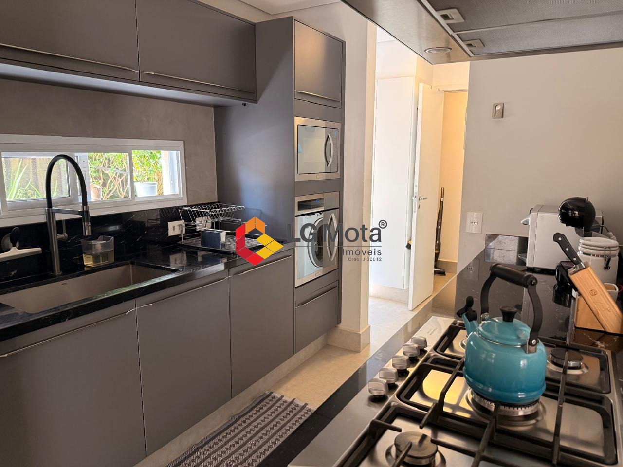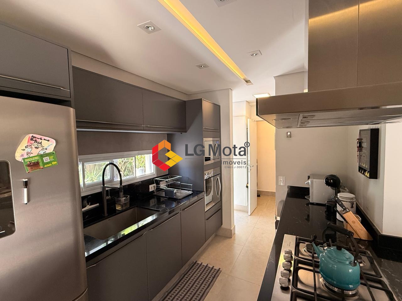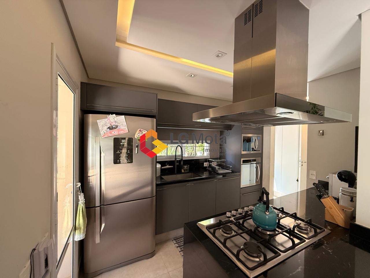 • Cozinha completa com Geladeira, Micro-ondas, Forno Elétrico e cooktop