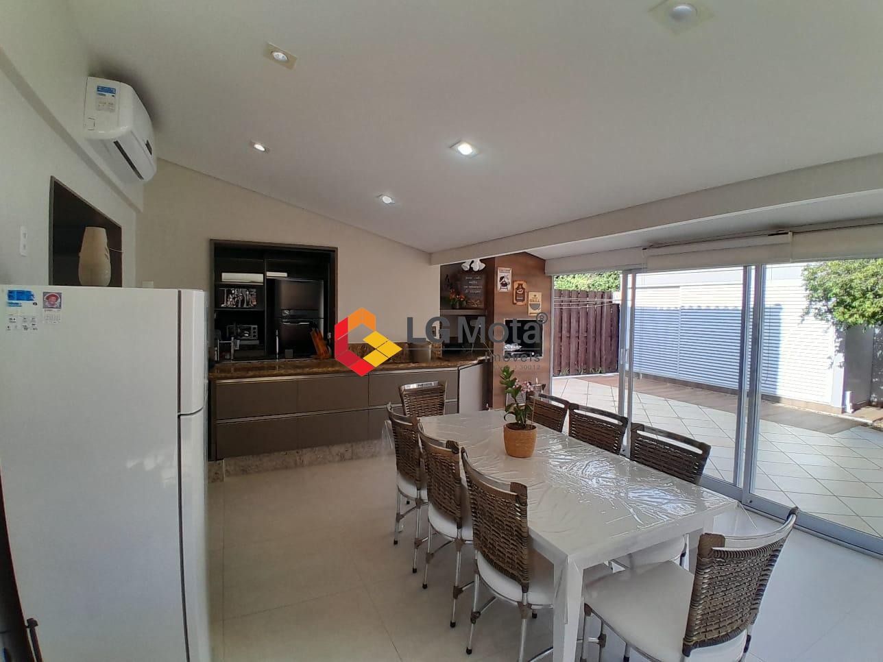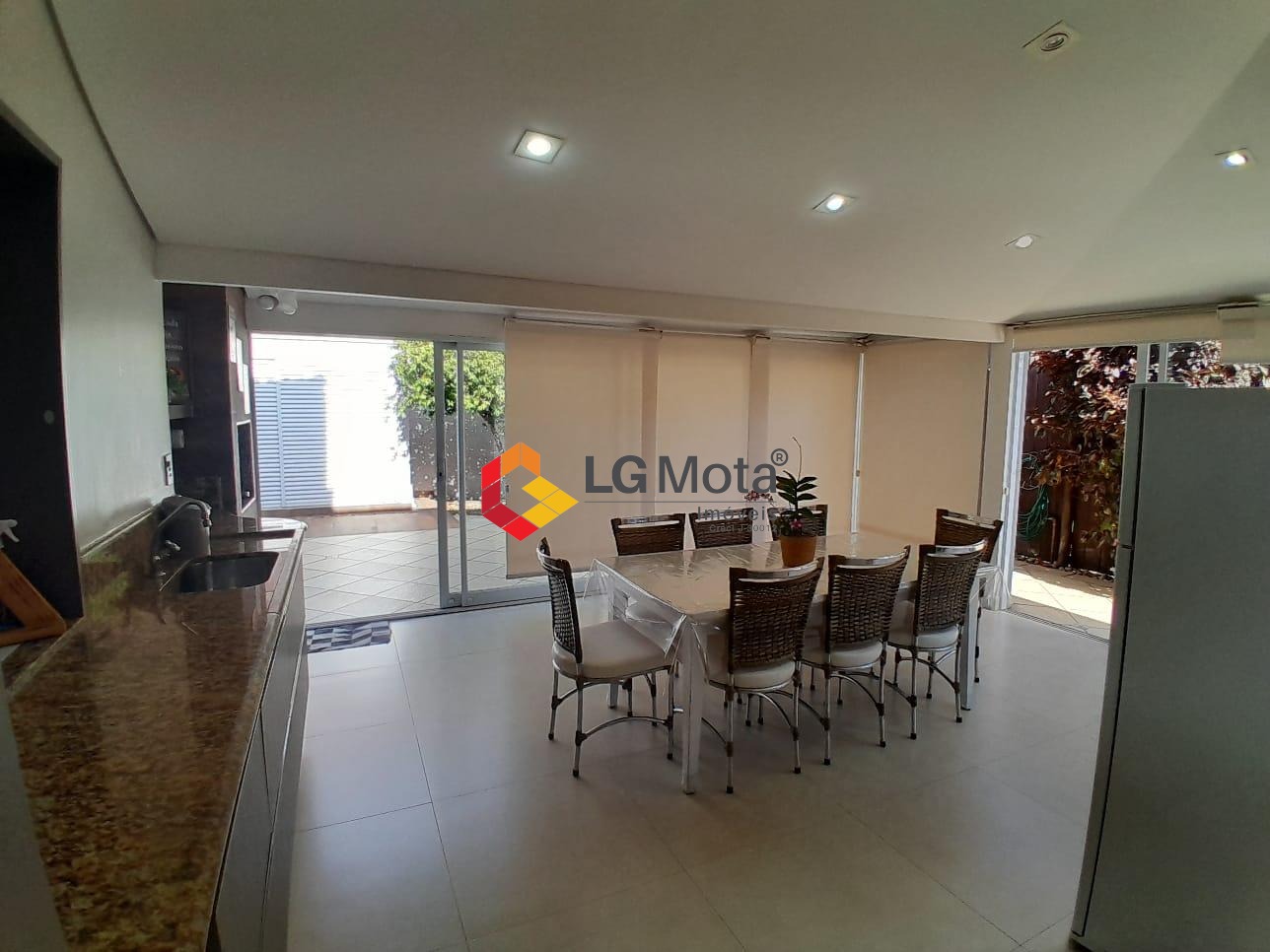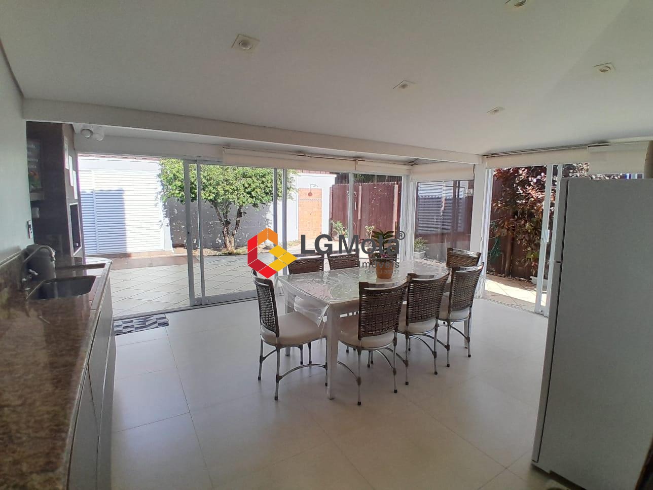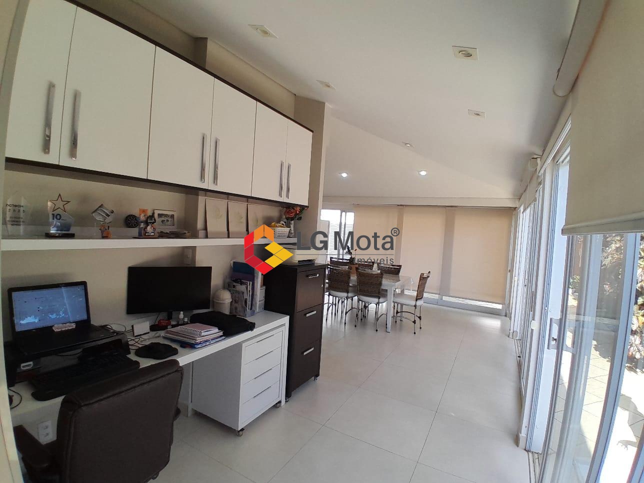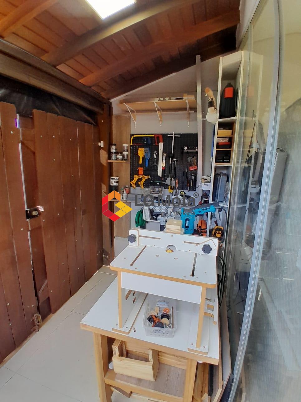 Quintal com uma linda área gourmet fechada com vidros e persianas rolô integrada com a sala, com churrasqueira, ar condicionado, e um escritório, ainda um ótimo depósito, ducha e uma oficina totalmente separada da casa.