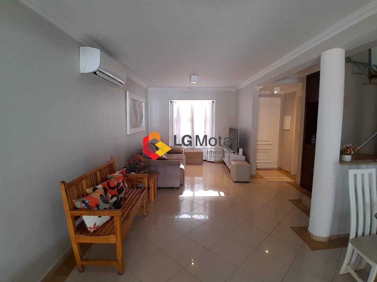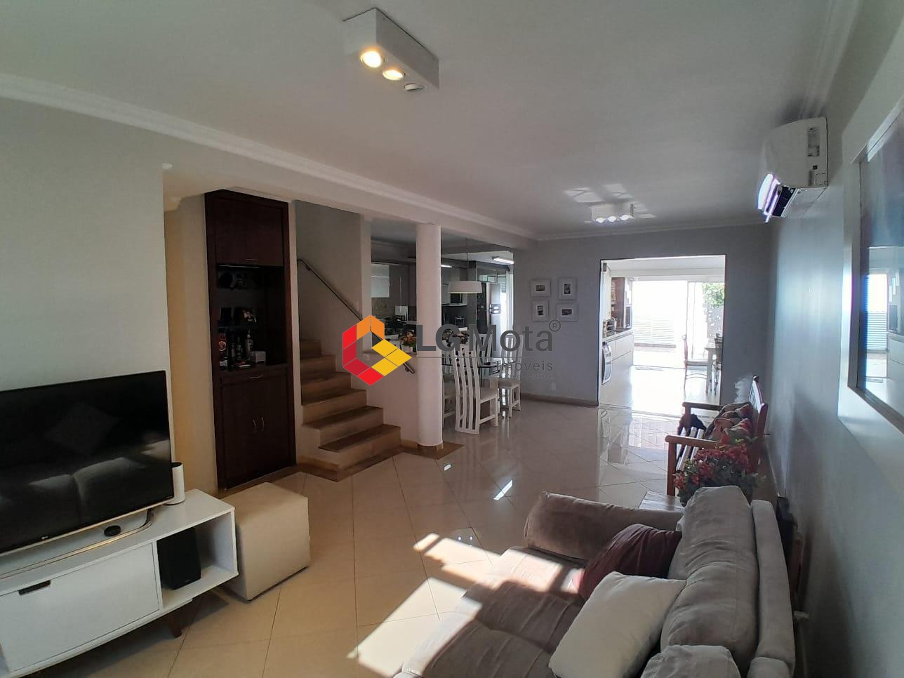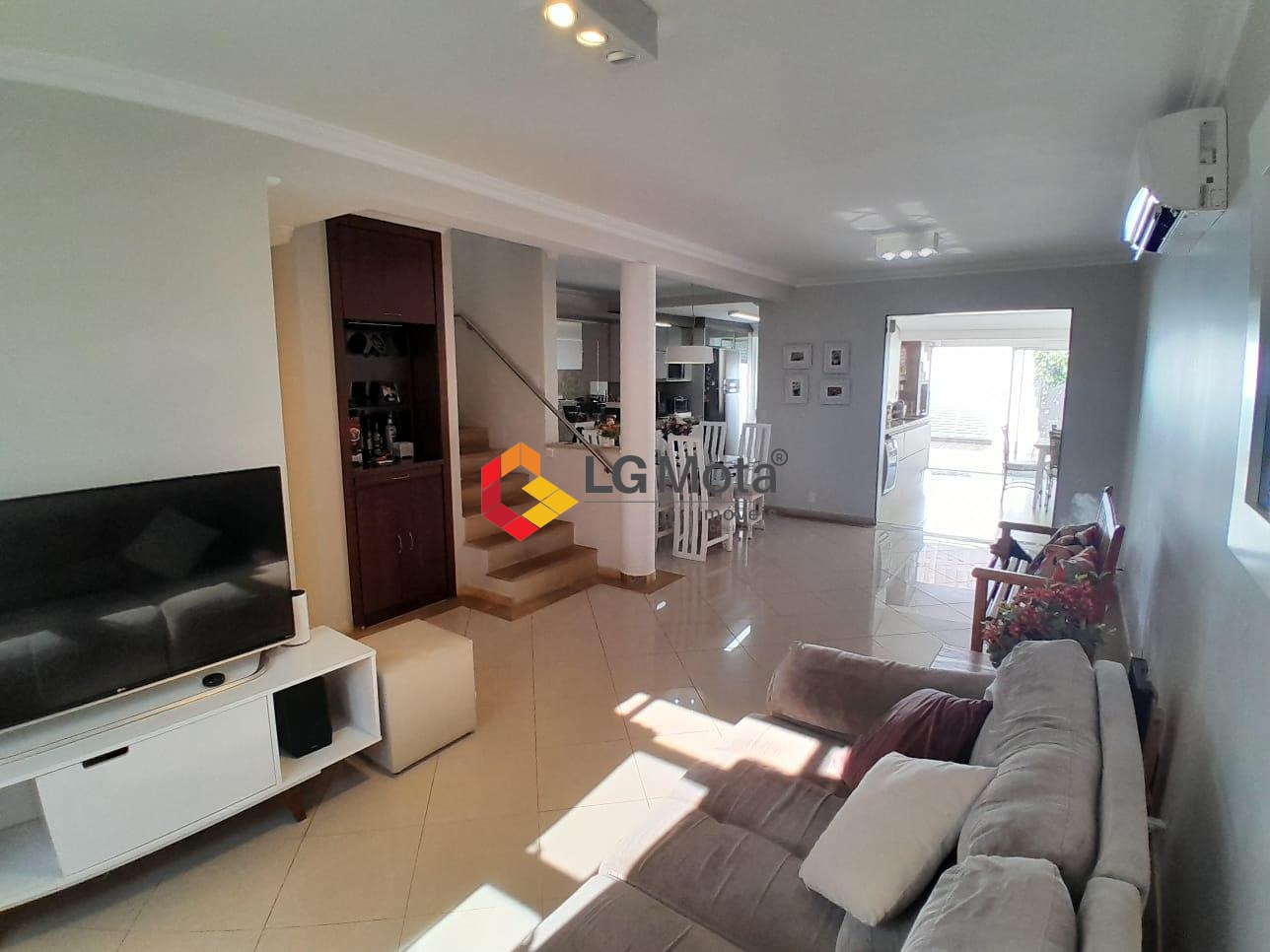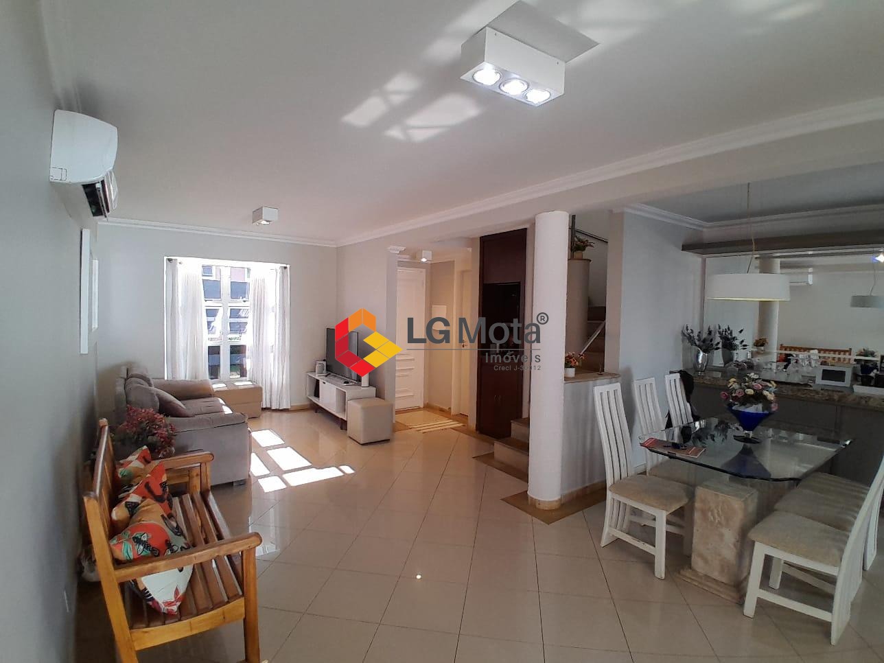 Living para 2 ambientes com ar condicionado, bar, piso porcelanato, integrado com a cozinha toda planejada, área de serviço separada, lavabo.
