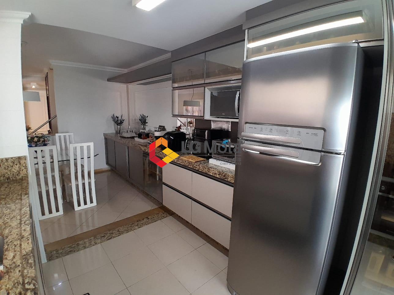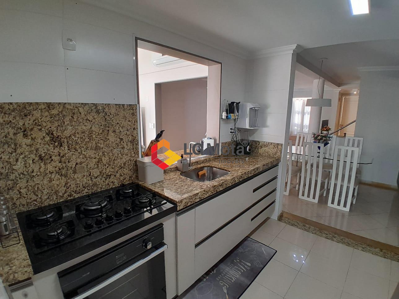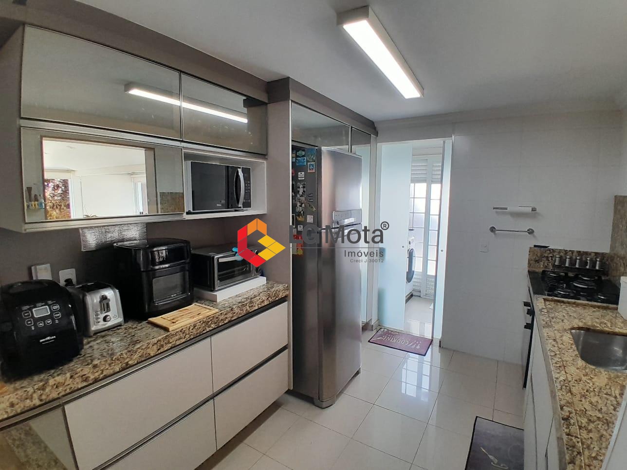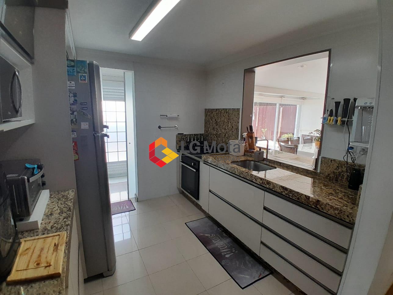 Living para 2 ambientes com ar condicionado, bar, piso porcelanato, integrado com a cozinha toda planejada, área de serviço separada, lavabo.