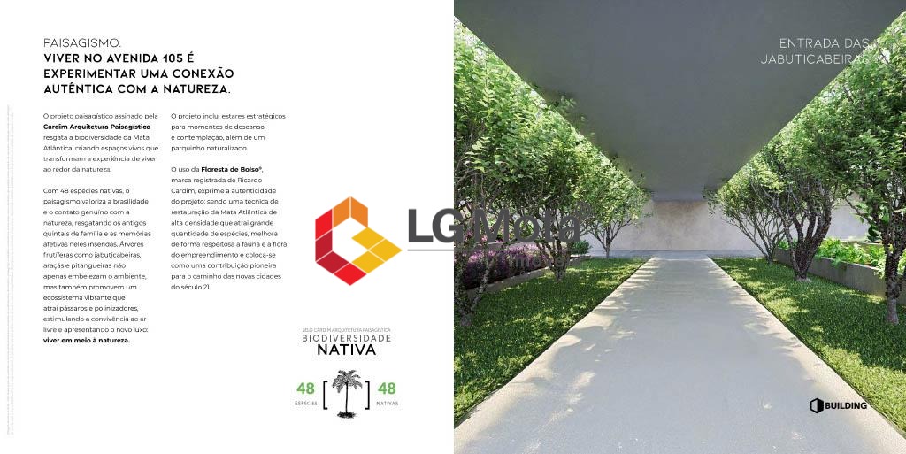 Diferenciando-se por sua fachada viva e design contemporâneo, o Avenida 105 se destaca pela sua ampla área de lazer e pelo paisagismo que valoriza a biodiversidade da Mata Atlântica. O projeto incorpora os traços inconfundíveis da Dal Pian Arquitetos, além de contar com a assinatura da Cardim Arquitetura Paisagística, que inclui sua criação inovadora: a Floresta de Bolso